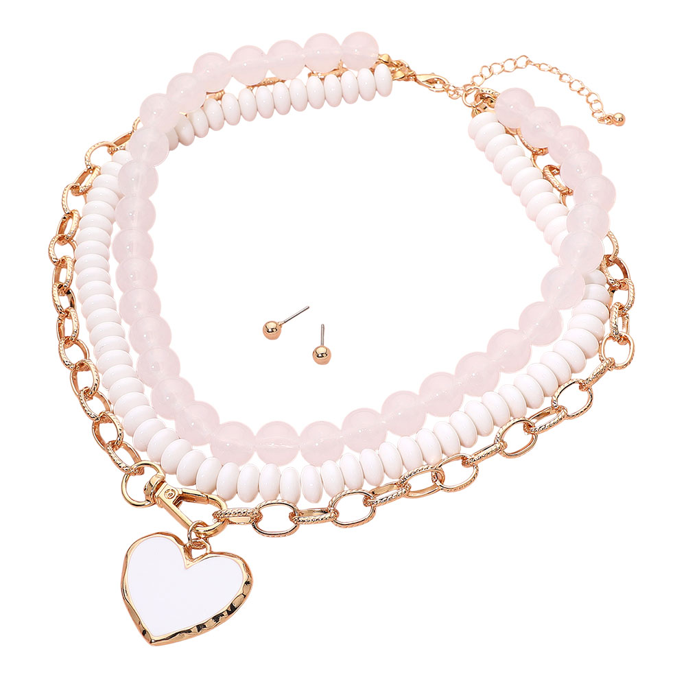 Enamel Heart Pendant Accent Chunky Beaded Layered Statement Necklace
