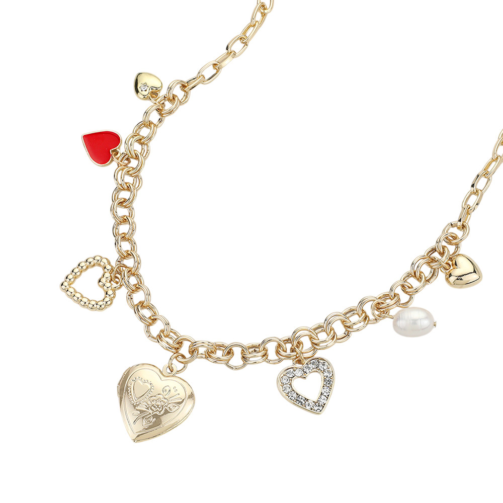 Enamel Stone Paved Metal Heart Pearl Charm Station Necklace