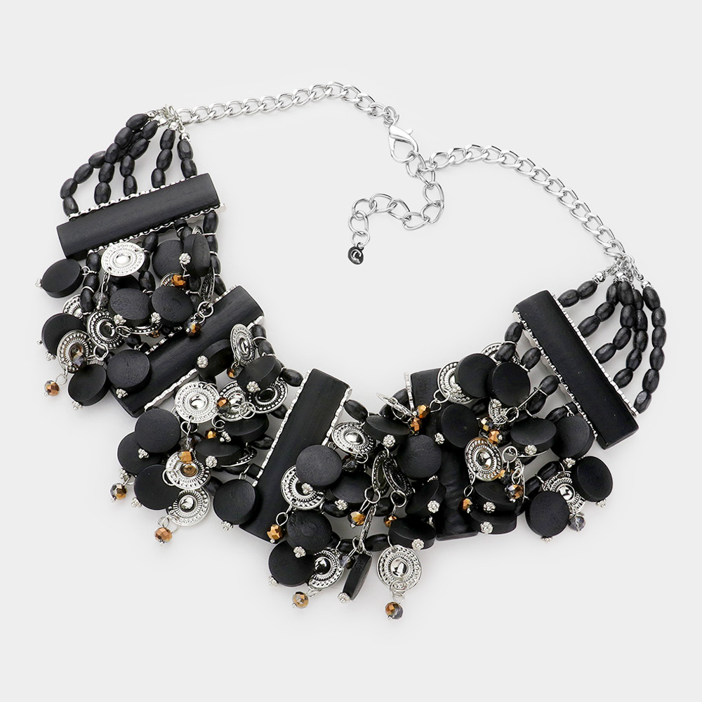 Disc Wood Cluster Beaded Bib Necklace