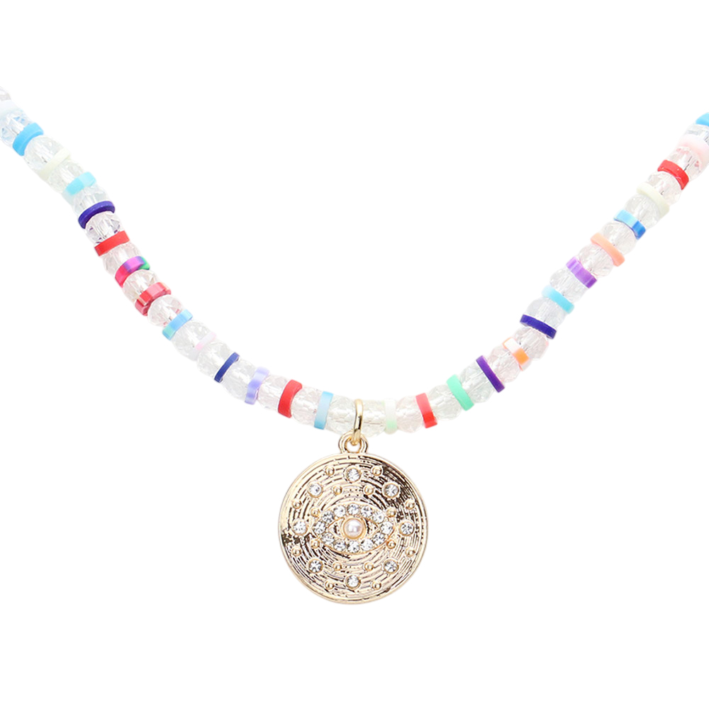 Evil Eye Accented Rhinestone Embellished Round Pendant Beaded Necklace