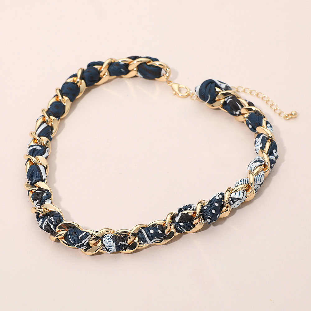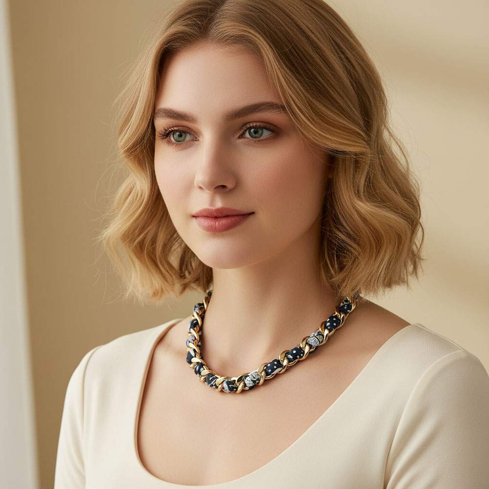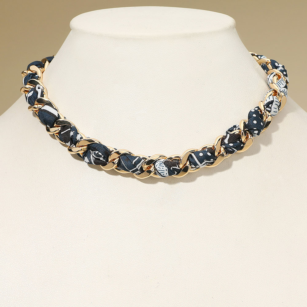 • This stylish chain link necklace features an interwoven fabric design for a chic and modern twist on a classic look. With its adjustable clasp, it offers both comfort and versatility, making it an ideal accessory to elevate casual outfits or complement elegant attire.