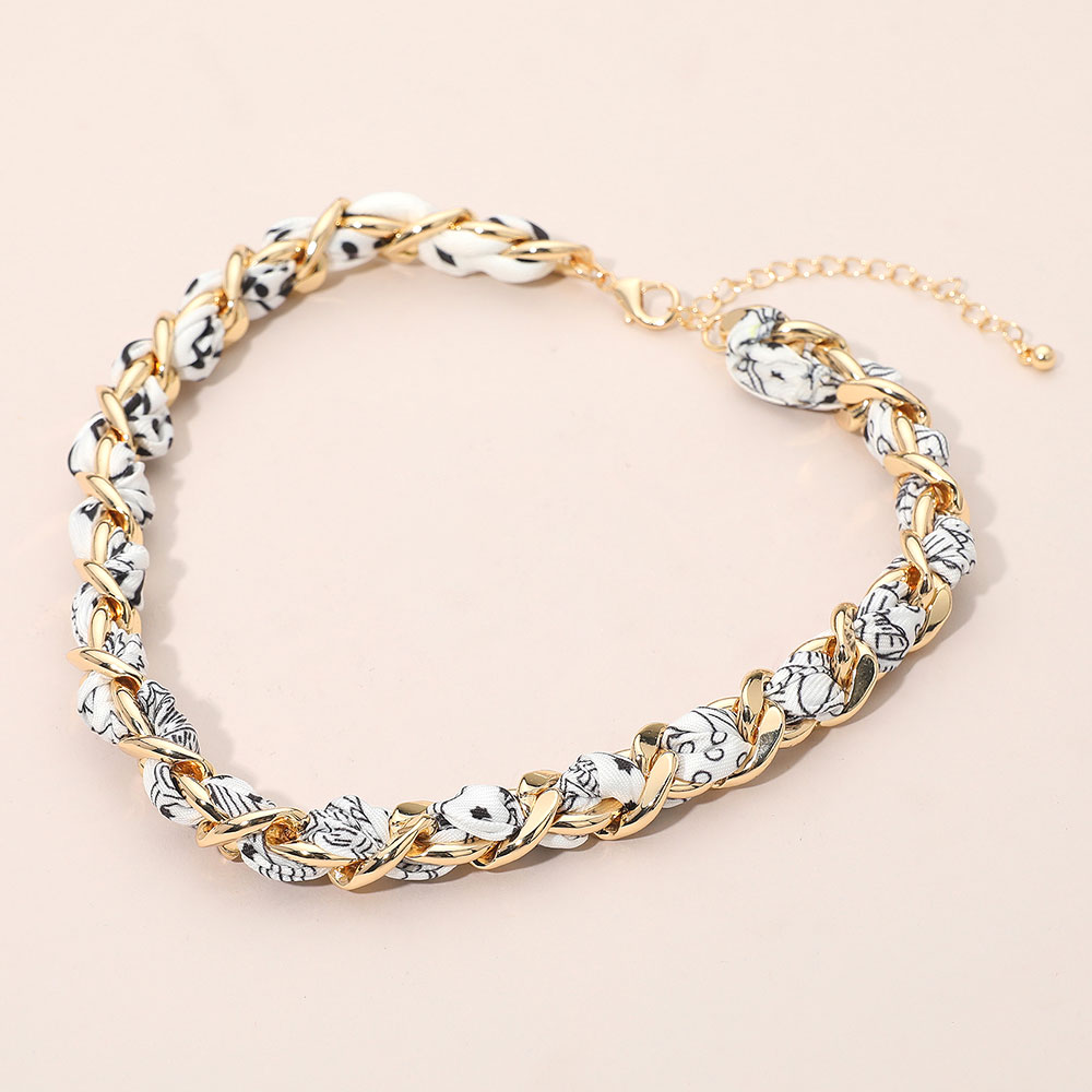 Details • Necklace Size : 15.5" + 3" L • Decor Size : 0.5" L • Print may vary • This stylish chain link necklace features an interwoven fabric design for a chic and modern twist on a classic look. With its adjustable clasp, it offers both comfort and versatility, making it an ideal accessory to elevate casual outfits or complement elegant attire. • Lead and Nickel Compliant