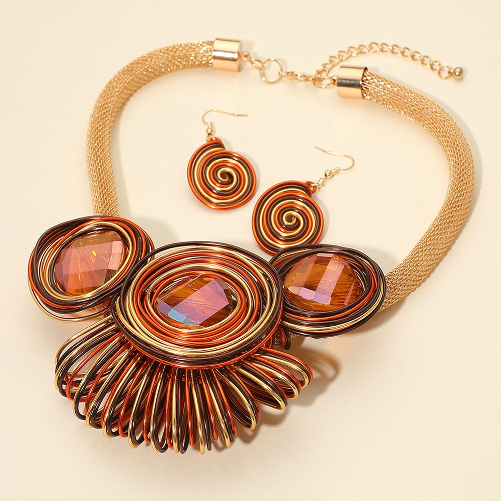 Details • Necklace Size : 17" + 3.5" L • Decor Size : 3.5" L • Earrings Size : 2.3" L • Elevate your style with this bold necklace and matching earrings set, featuring intricate coiled details and faceted crystal-like accents. Perfect for special occasions or evening wear, this eye-catching set adds modern sophistication and artistic flair to any outfit. • Lead and Nickel Compliant