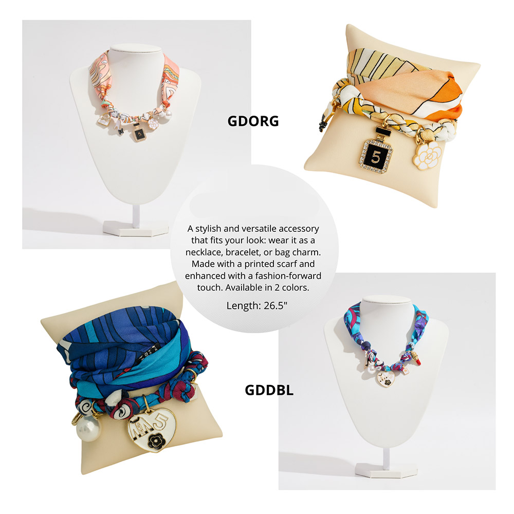 Details • Size : 26.5" L • Charm Size : 1.5" L • Print may vary • A chic scarf accessory designed to be worn as a necklace, bracelet, or bag charm. Featuring a printed scarf with stylish fashion-inspired charms, it adds a versatile and modern touch to your look. Available in 2 unique designs for standout style. • Brass • Gold Dipped • Hypoallergenic • Lead and Nickel Compliant • Made In Korea