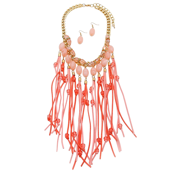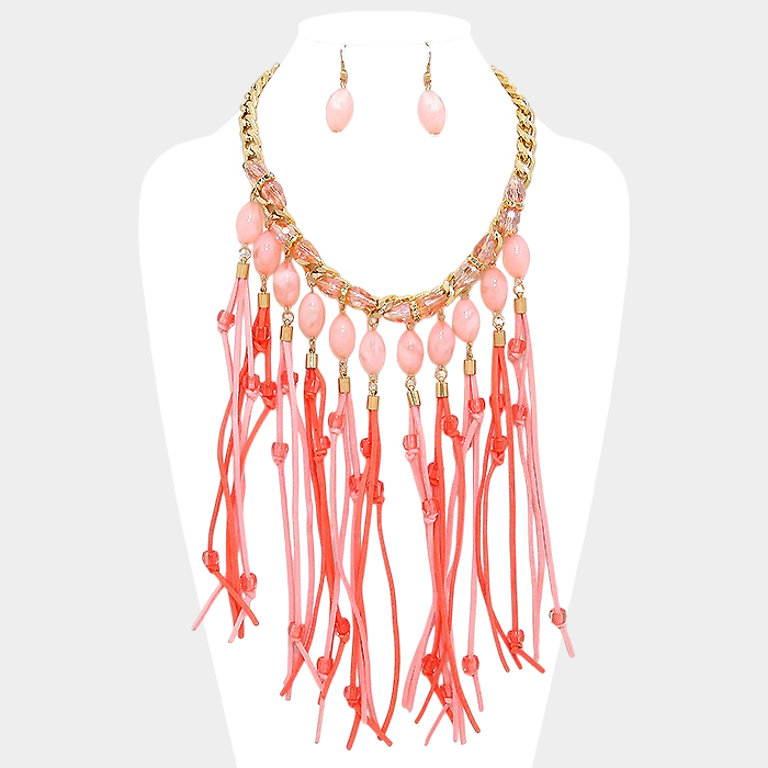 Faux Suede Fringe & Marble Bead Bib Necklace