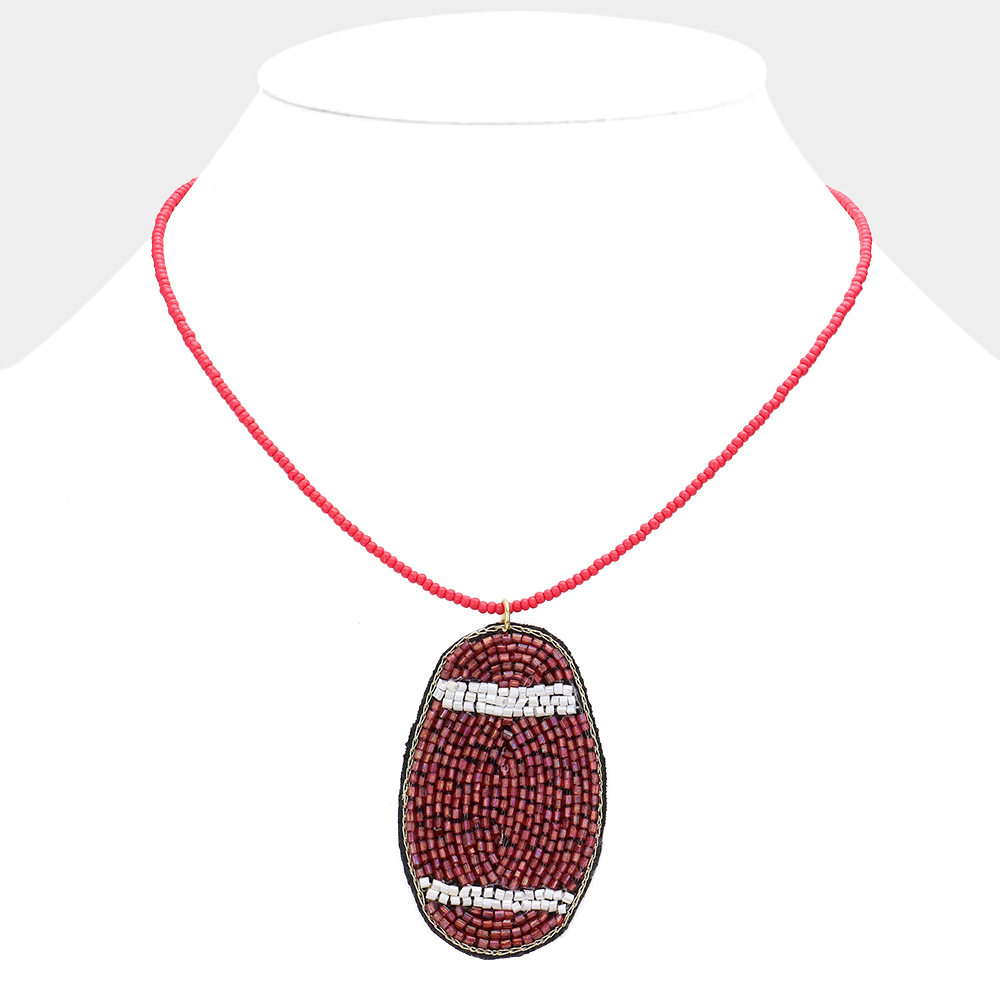 Details • Necklace Size : 14" + 3" L • Pendant Size : 1.25" X 2.2" • Fun football pendant necklace designed with tiny seed beads on a sleek beaded chain. Perfect accessory for gameday outfits or sporty casual looks. Lightweight and playful, this handcrafted necklace adds a unique touch of team spirit and charm to any ensemble. • Lead and Nickel Compliant • Made In India
