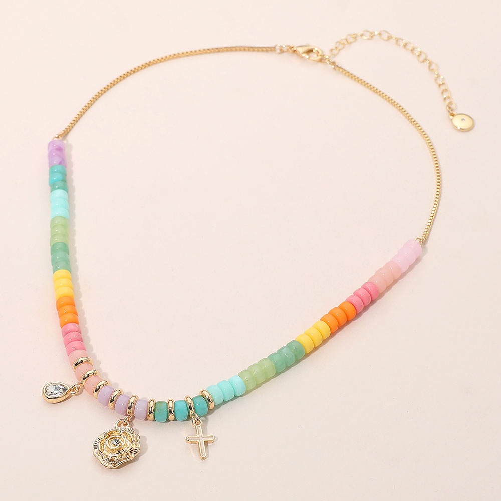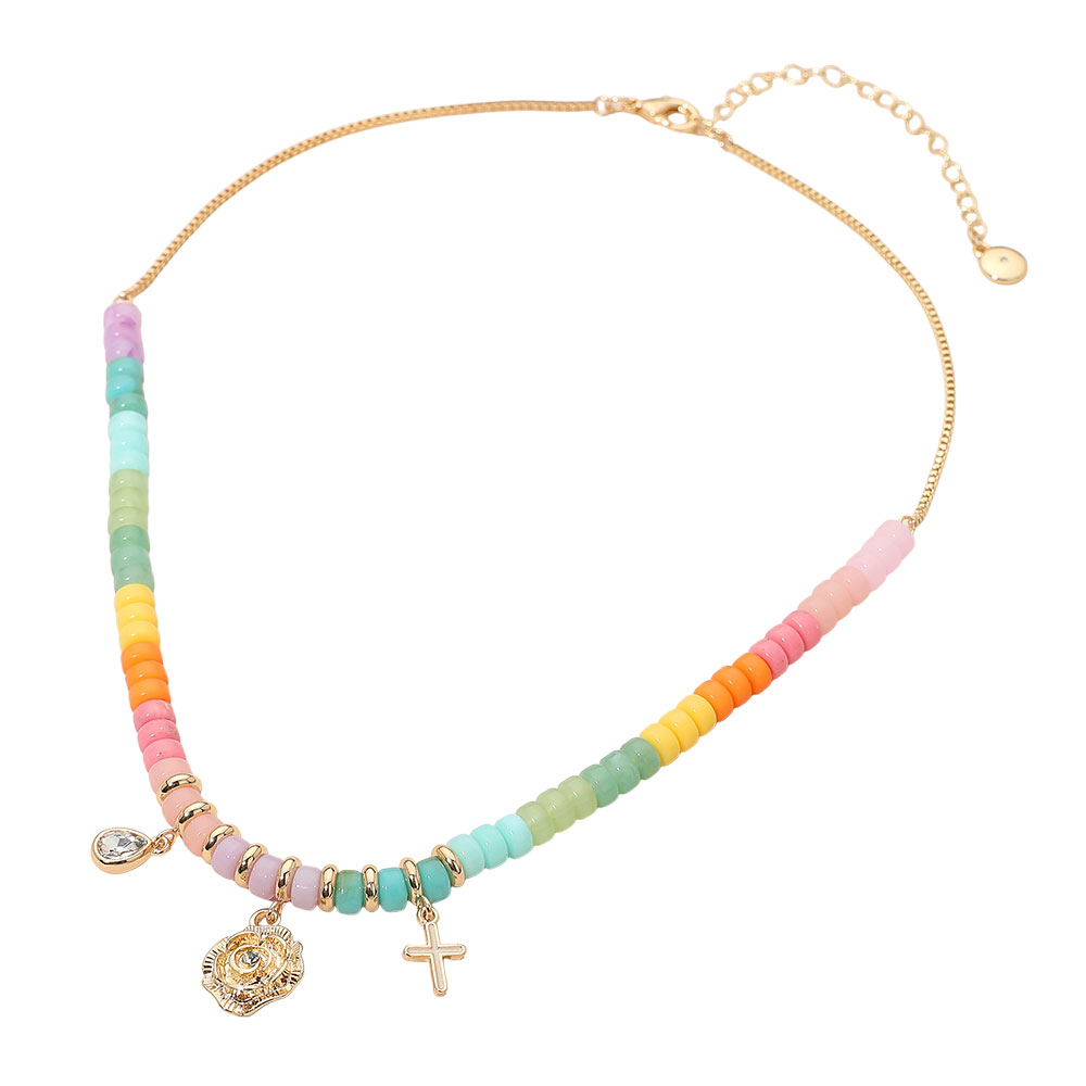 Details • Necklace Size : 16" + 3.5" L • Decor Size : 1" L • Brighten your look with this multicolor bead charm necklace featuring vibrant tones and elegant gold accents. Adorned with symbolic pendants including a cross and medallion, this statement piece blends playful energy with refined style for a chic, expressive finish. • Lead and Nickel Compliant