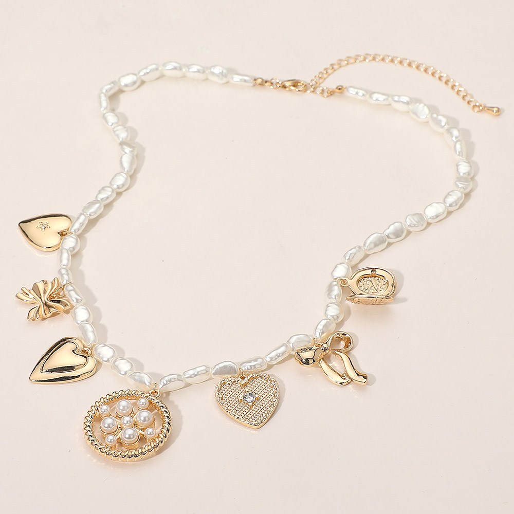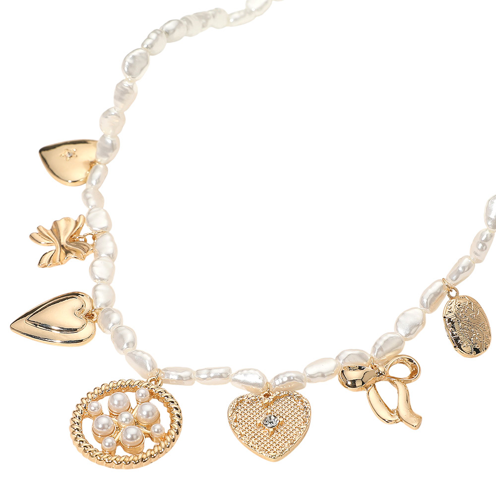 Details • Necklace Size : 15.5" + 3.5" L • Decor Size : 1" L • This pearl-inspired charm necklace features an elegant mix of heart, bow, and medallion pendants for a refined yet playful finish. Its delicate beading and polished charms make it a statement accessory, perfect for adding a sophisticated touch to both everyday and dressy looks. • Lead and Nickel Compliant