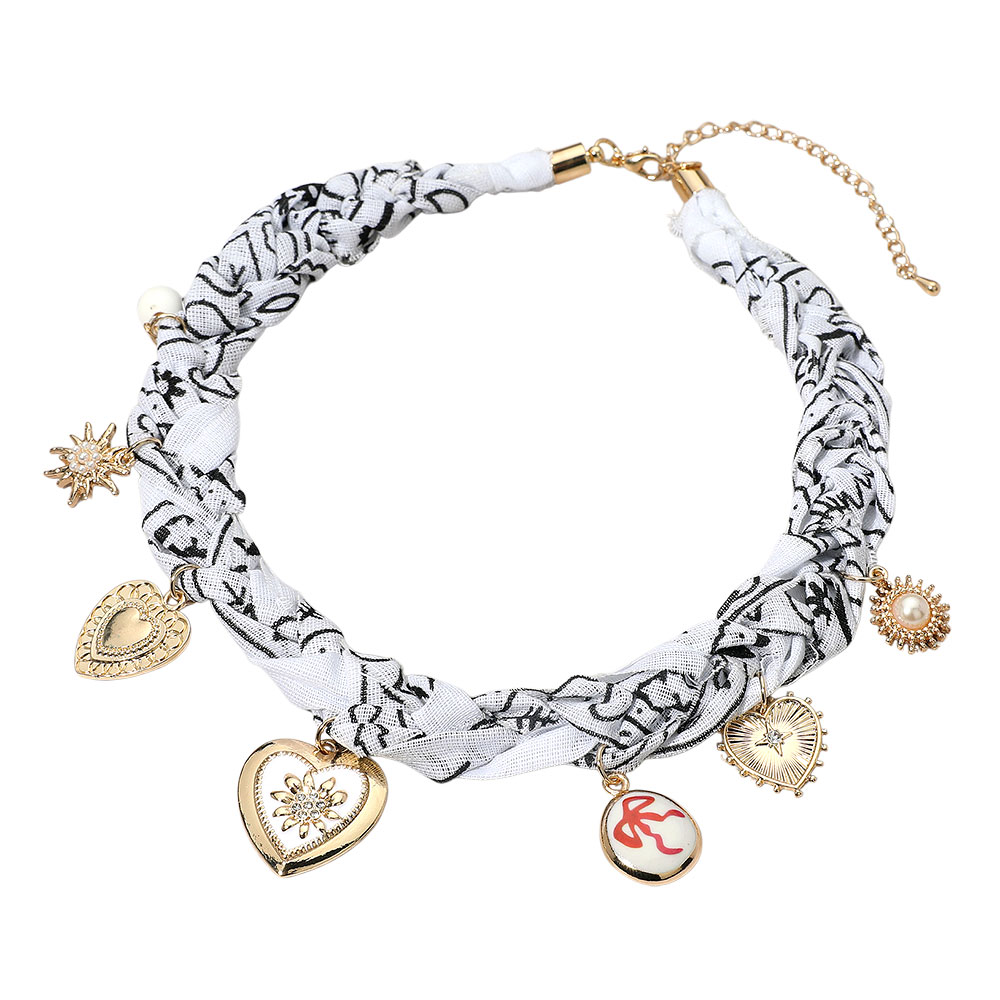 Details • Necklace Size : 16" + 3" L • Decor Size : 1.75" L • A unique braided fabric necklace adorned with a mix of charms including hearts, pearls, and sun-inspired pendants. The combination of soft fabric and gold-tone details creates a statement look that’s both playful and chic. Adjustable for comfort, this necklace is a standout piece that pairs effortlessly with casual or dressy outfits. • Lead and Nickel Compliant