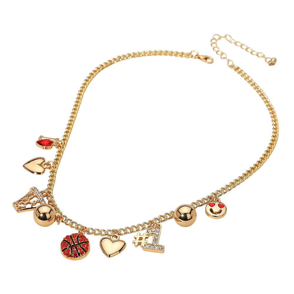 Details • Necklace Size : 16" + 3" L • Decor Size : 1" L • Celebrate your sporty side with this basketball charm necklace featuring playful pendants like a hoop, heart, emoji, and “#1” emblem. Designed for style lovers with team spirit, it adds a fun, energetic accent to any outfit and makes a perfect gift for sports fans or trendsetters. • Lead and Nickel Compliant