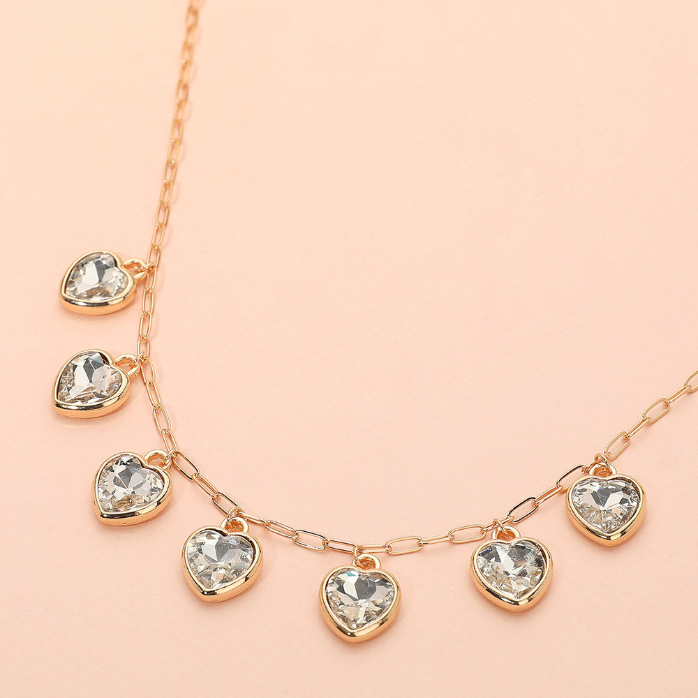 Details • Necklace Size : 16.5" + 3" L • Decor Size : 0.8" L • Elegant chain necklace featuring dangling faceted heart charms that add sparkle and movement to any look. Lightweight, adjustable, and perfect for layering or wearing alone. A chic accessory for gifting or daily wear. • Lead and Nickel Compliant
