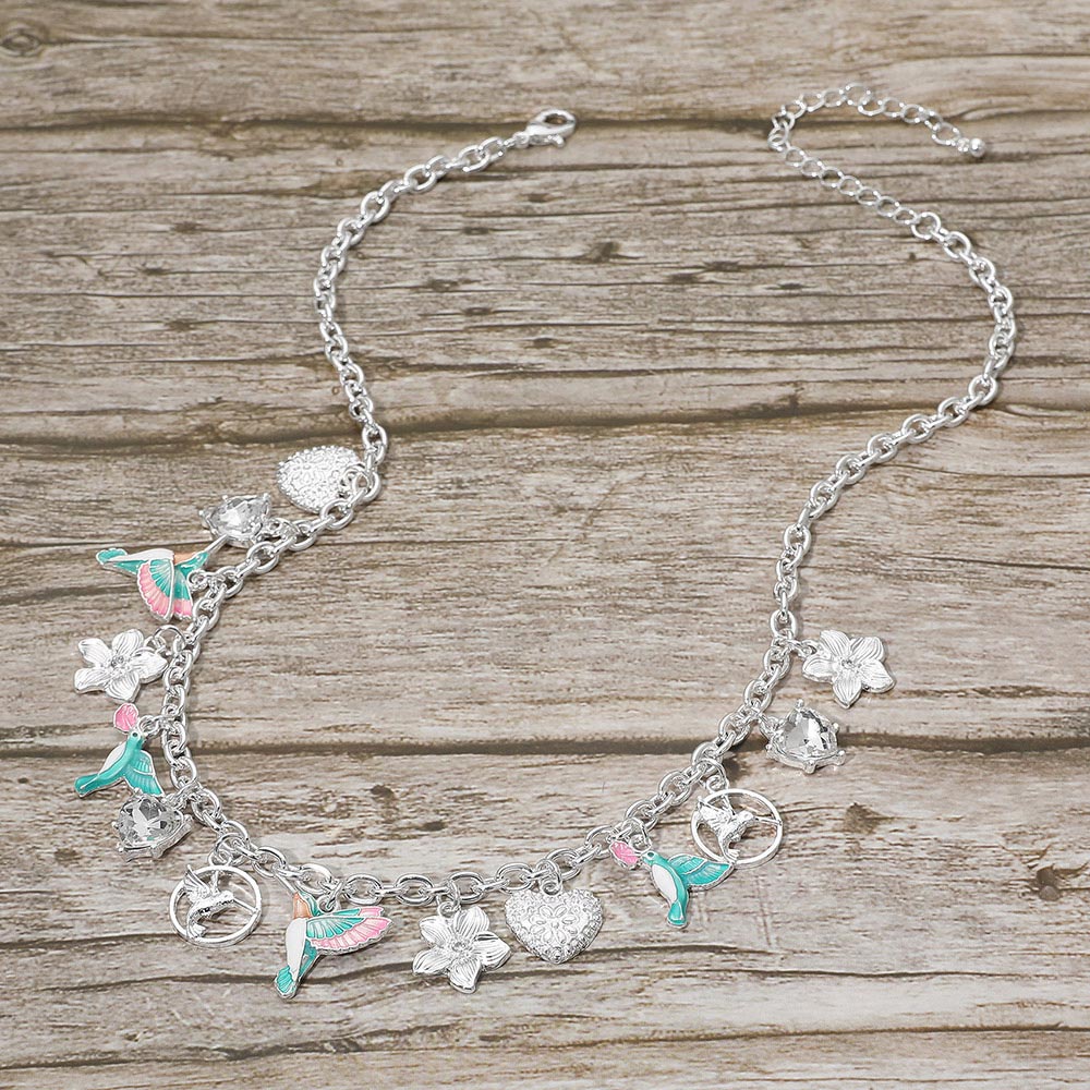 Details • Necklace Size : 18" + 3" L • Decor Size : 1" L • Delicate and eye-catching, this charm necklace features hummingbird and floral accents with heart details, creating a whimsical accessory full of movement and charm. Perfect for adding a playful, nature-inspired touch to both casual and dressy outfits. • Lead and Nickel Compliant