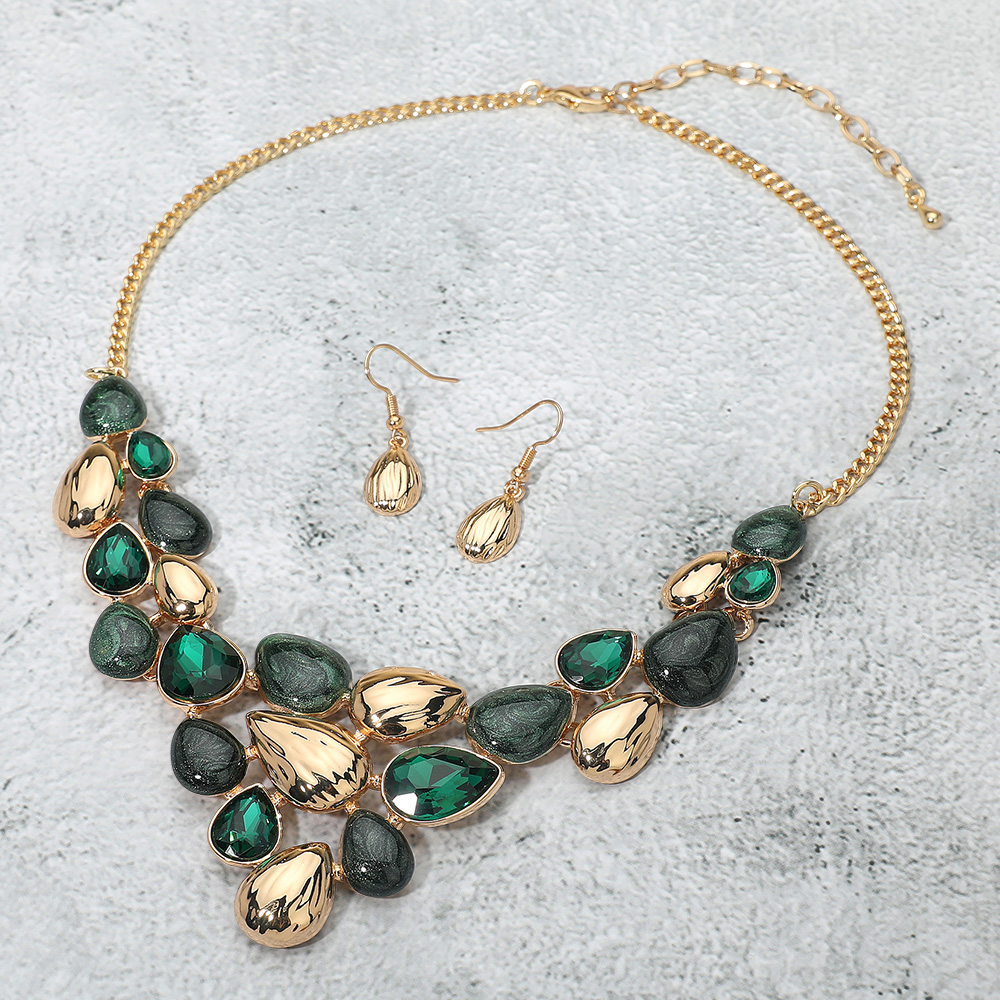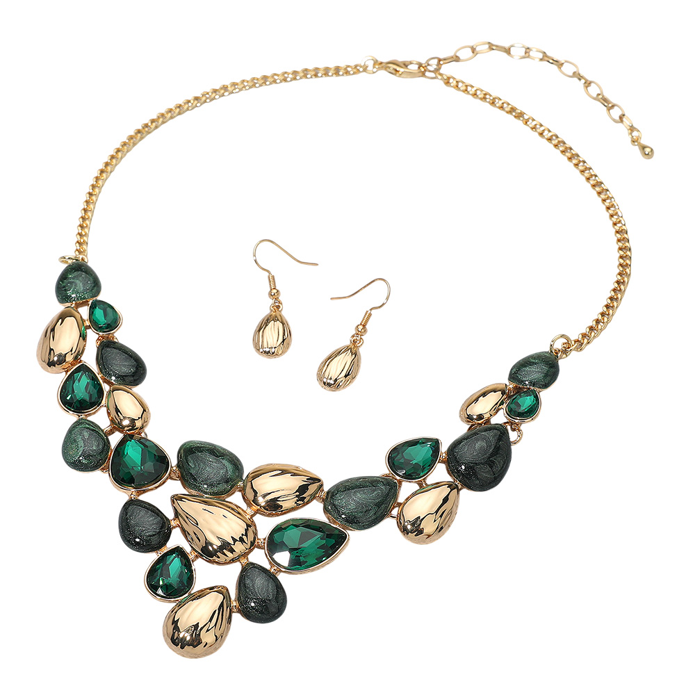 • Bold necklace and earring set featuring teardrop-shaped accents and sparkling stones. Perfect for elevating formal attire or adding glamour to special occasions.