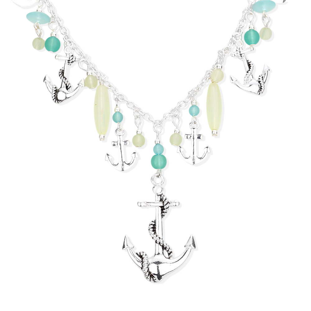 White Gold Dipped Enamel Anchor Pink Ribbon Pendant Necklace