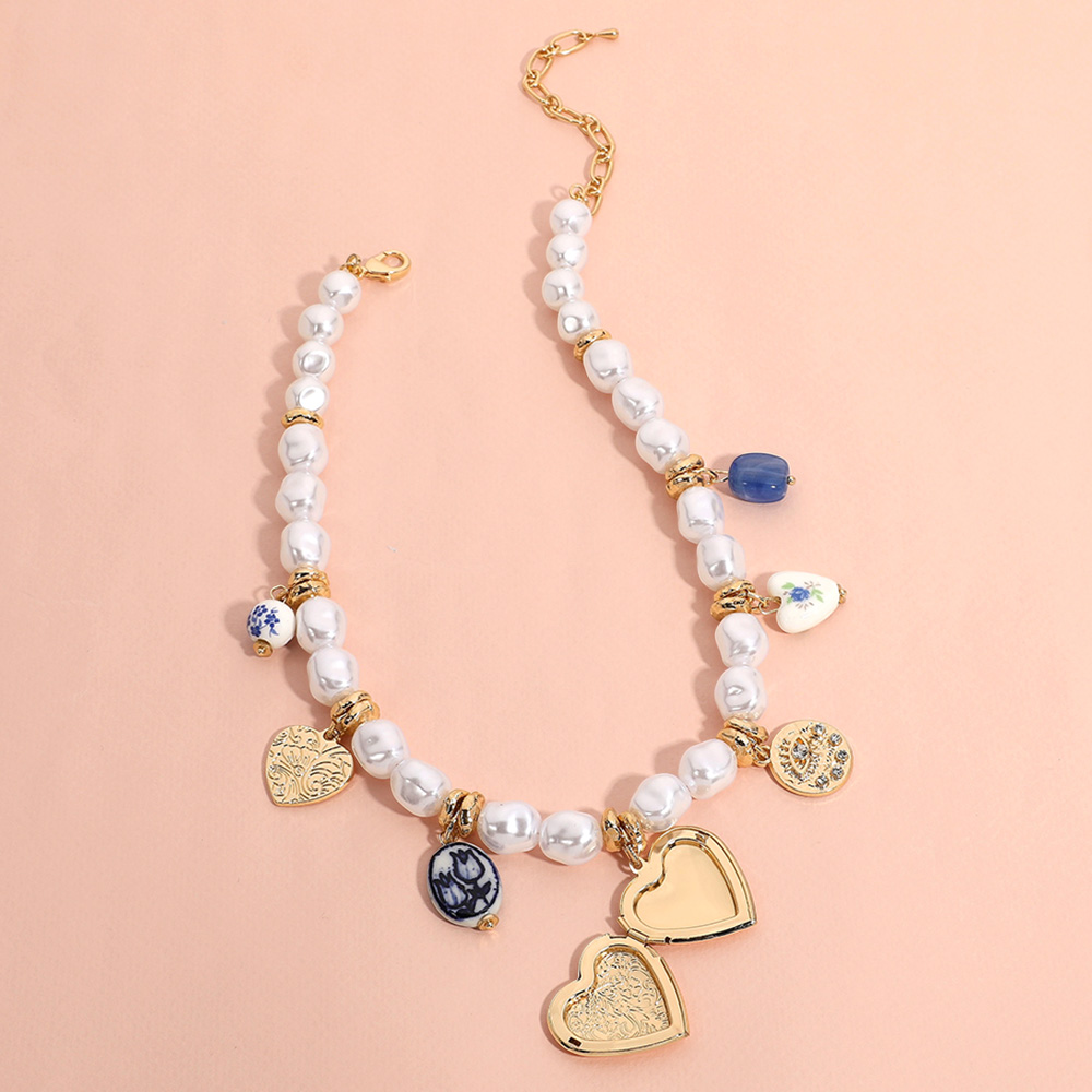 Details • Necklace Size : 15.5" + 4" L • Decor Size : 1.5" L • Chic pearl charm necklace adorned with heart, coin, and decorative pendants, blending elegance with a playful statement look. Perfect for layering or wearing alone, this unique accessory elevates everyday outfits and adds a fashionable touch to special occasions or gift collections. • Lead and Nickel Compliant