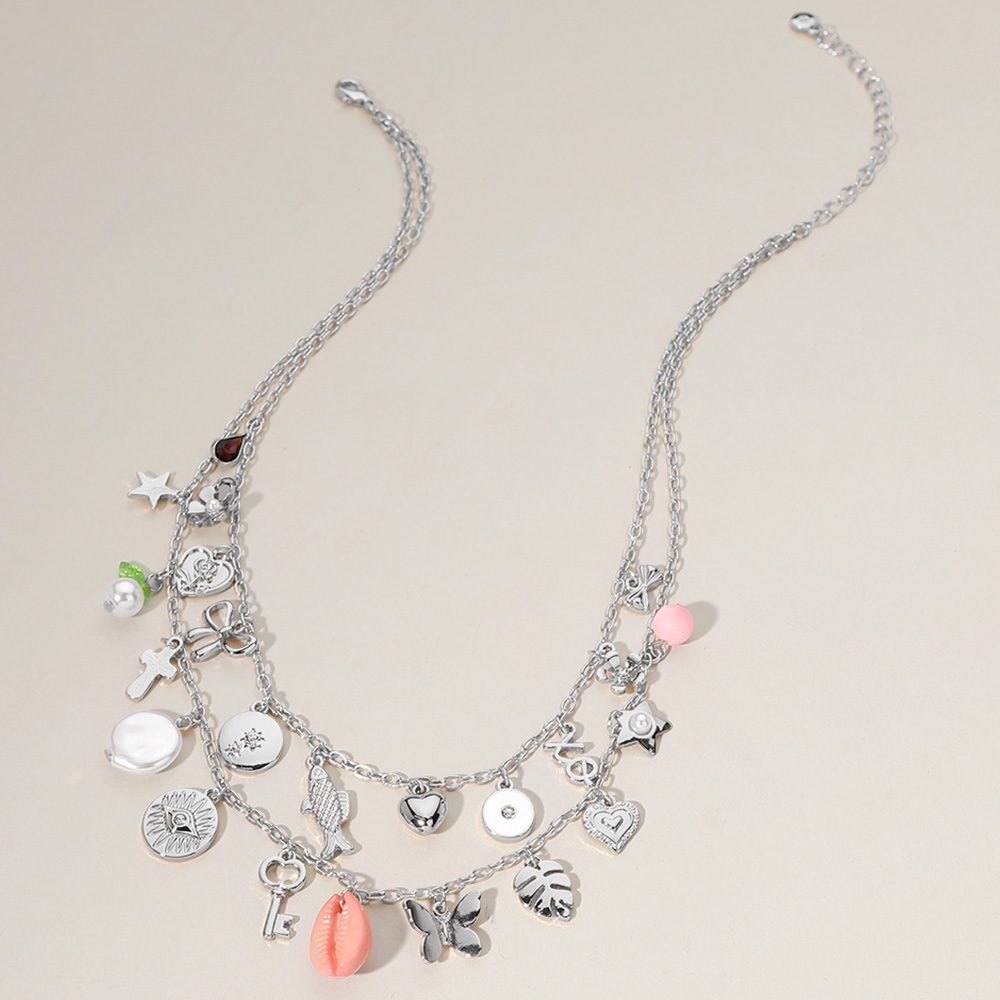 • Elevate your look with this multi-charm layered necklace featuring playful pendants like hearts, butterflies, stars, and more. A stylish accessory that adds personality and flair to any outfit, perfect for layering or wearing solo as a bold fashion statement.
