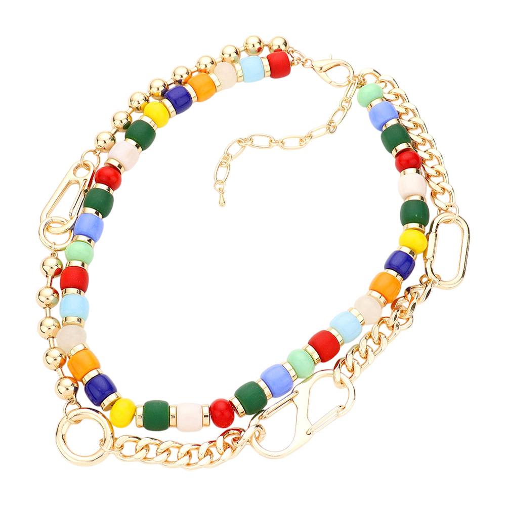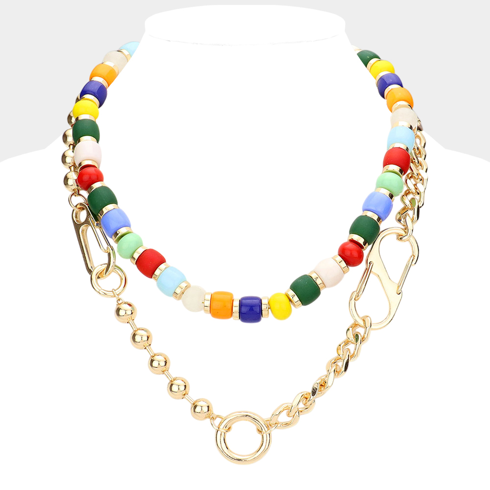 Colorful Bead Pointed Pearl Double Layered Bib Necklace
