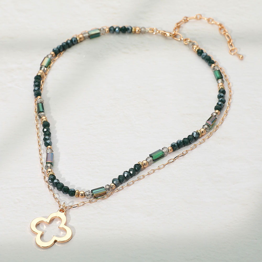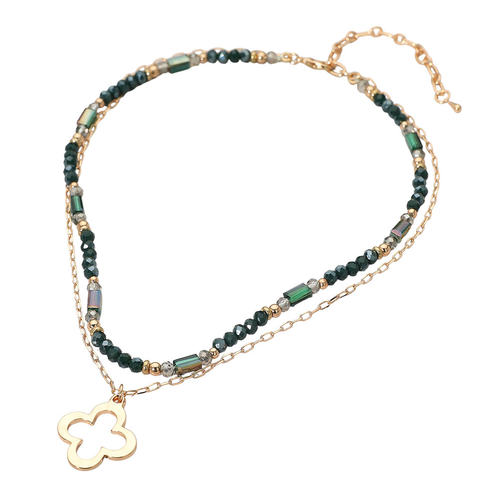 Metal Open Quatrefoil Pendant Faceted Beaded Layered Necklace