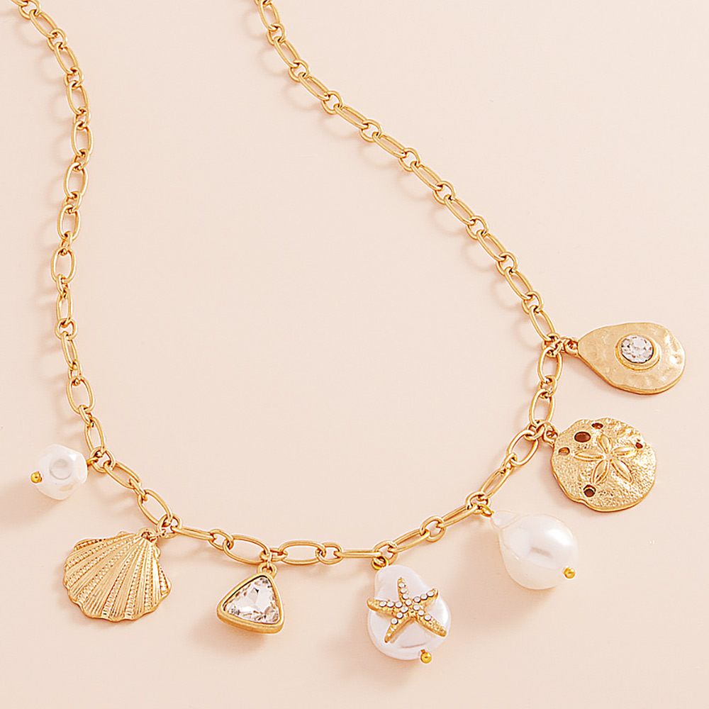 Metal Seashell Sand Dollar Pearl Starfish Charm Station Necklace