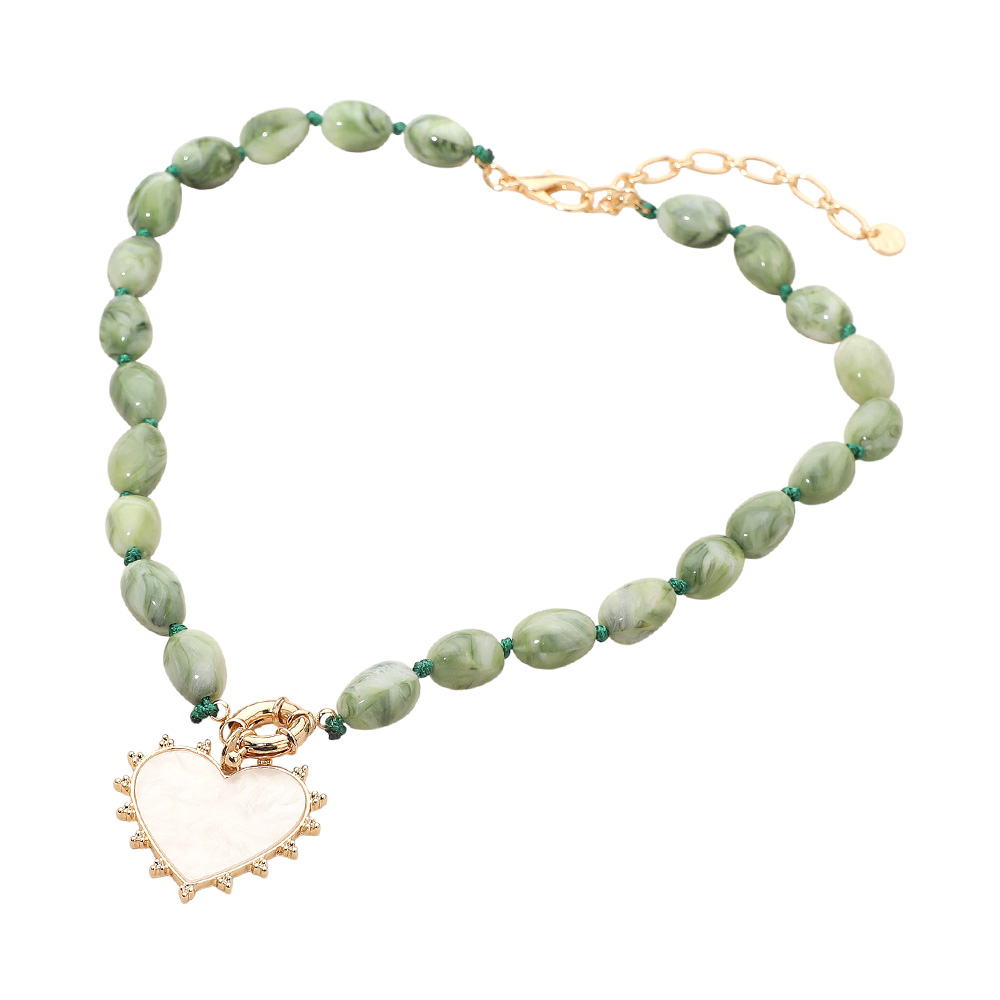 Details • Necklace Size : 20.5" + 4" L • Decor Size : 1.75" L • Elegant beaded necklace designed with marbled beads and a statement heart pendant charm. A fashionable accessory perfect for everyday wear or special occasions, adding romantic charm and a unique finishing touch. • Lead and Nickel Compliant