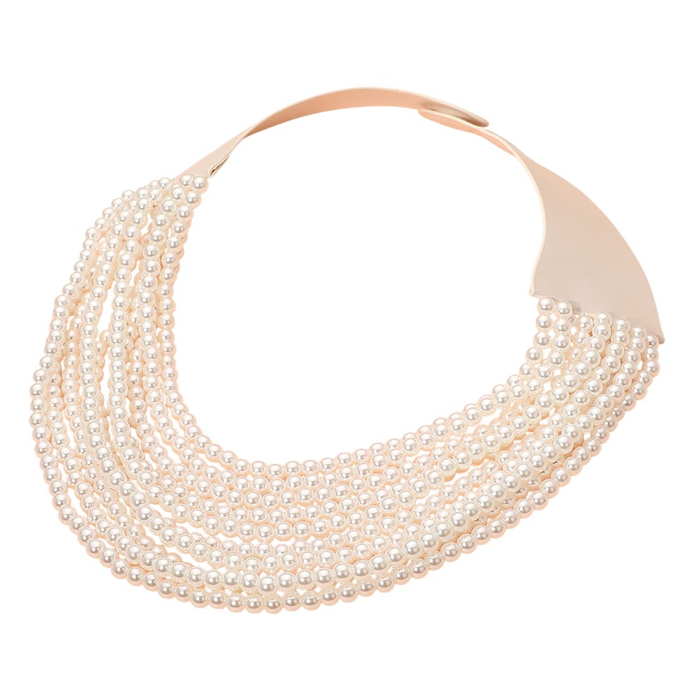 Details • Necklace Size : 18" + 1" L • Decor Size : 2.5" L • Magnetic Closure • Statement collar necklace featuring a flexible curved silhouette and layered beaded design with a secure magnetic closure. Designed to sit comfortably along the neckline, this bold yet refined accessory adds dimension and modern elegance to fashion collections, event styling, and trend-driven looks. • Lead and Nickel Compliant