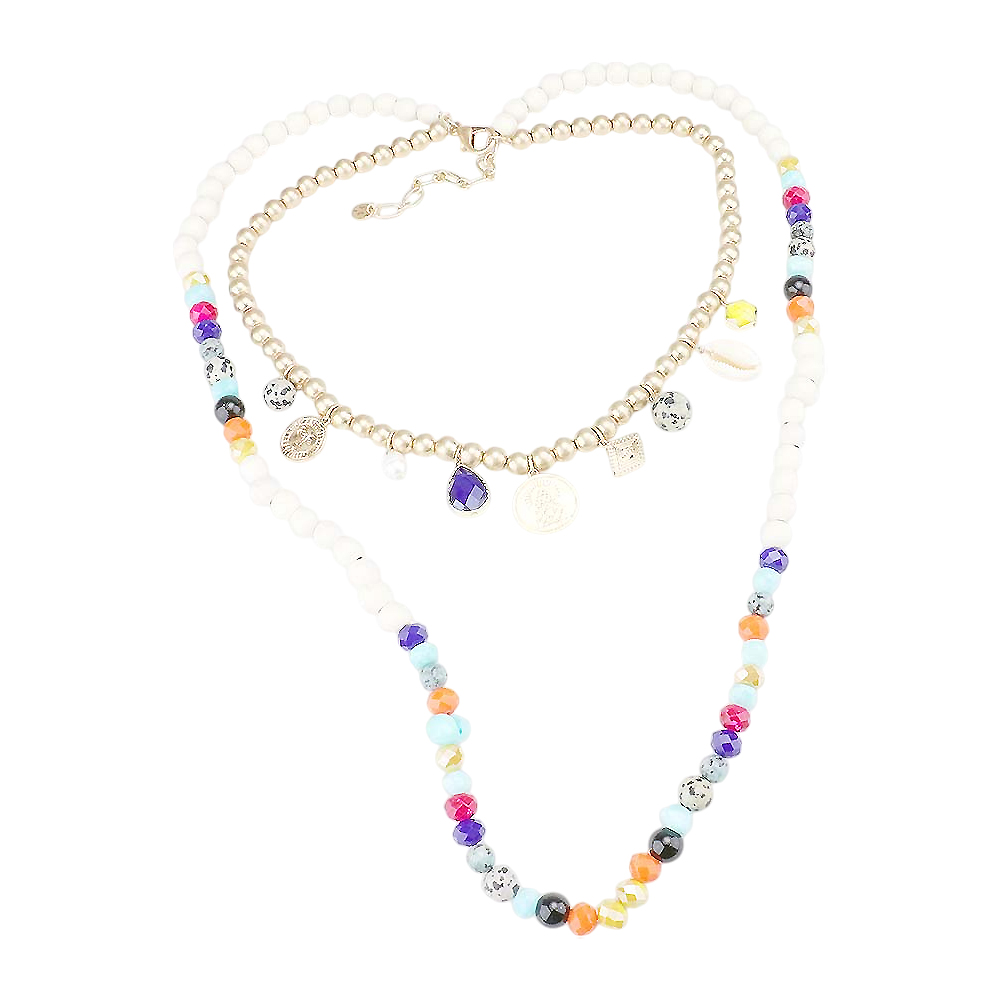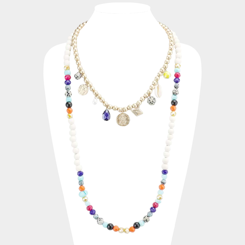 Colored Wood Open Metal Oval Link Triple Layered Necklace