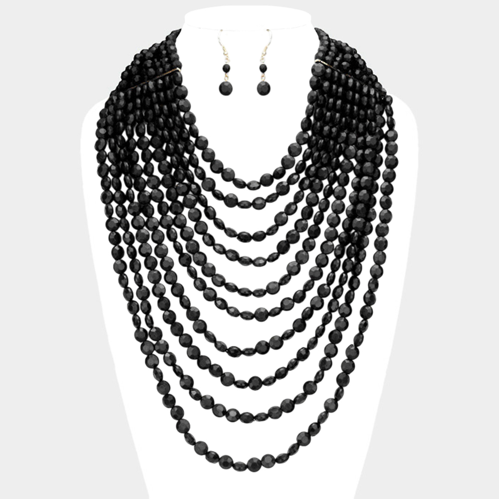 Wooden Stone Embellished Cylinder Textured Metal Oval Tip Station Collar Statement Necklace