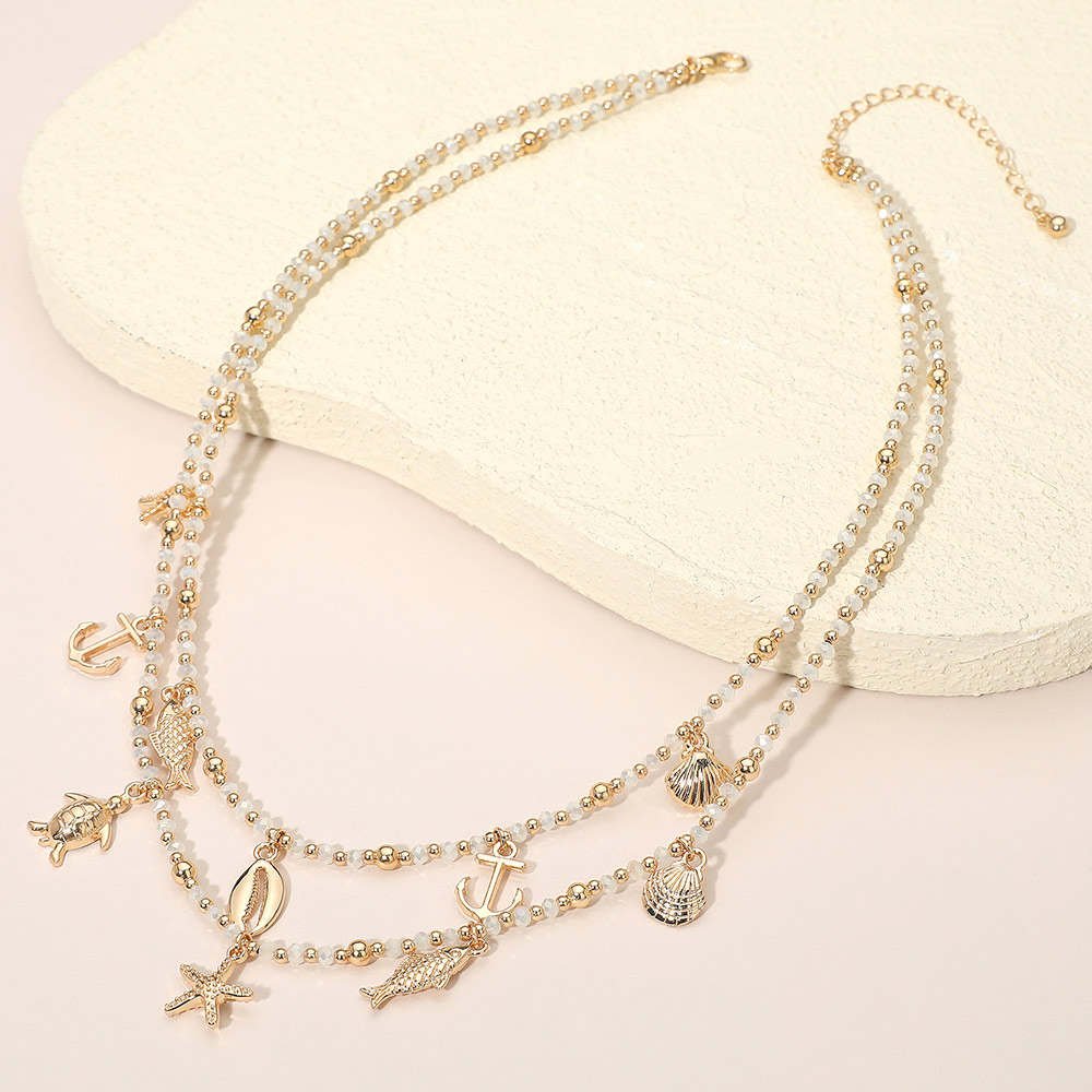 • This layered beaded necklace features charming ocean-inspired pendants including seashells, fish, and anchors. A stylish accessory that brings a touch of coastal elegance to your look, perfect for adding playful detail to everyday or vacation outfits.