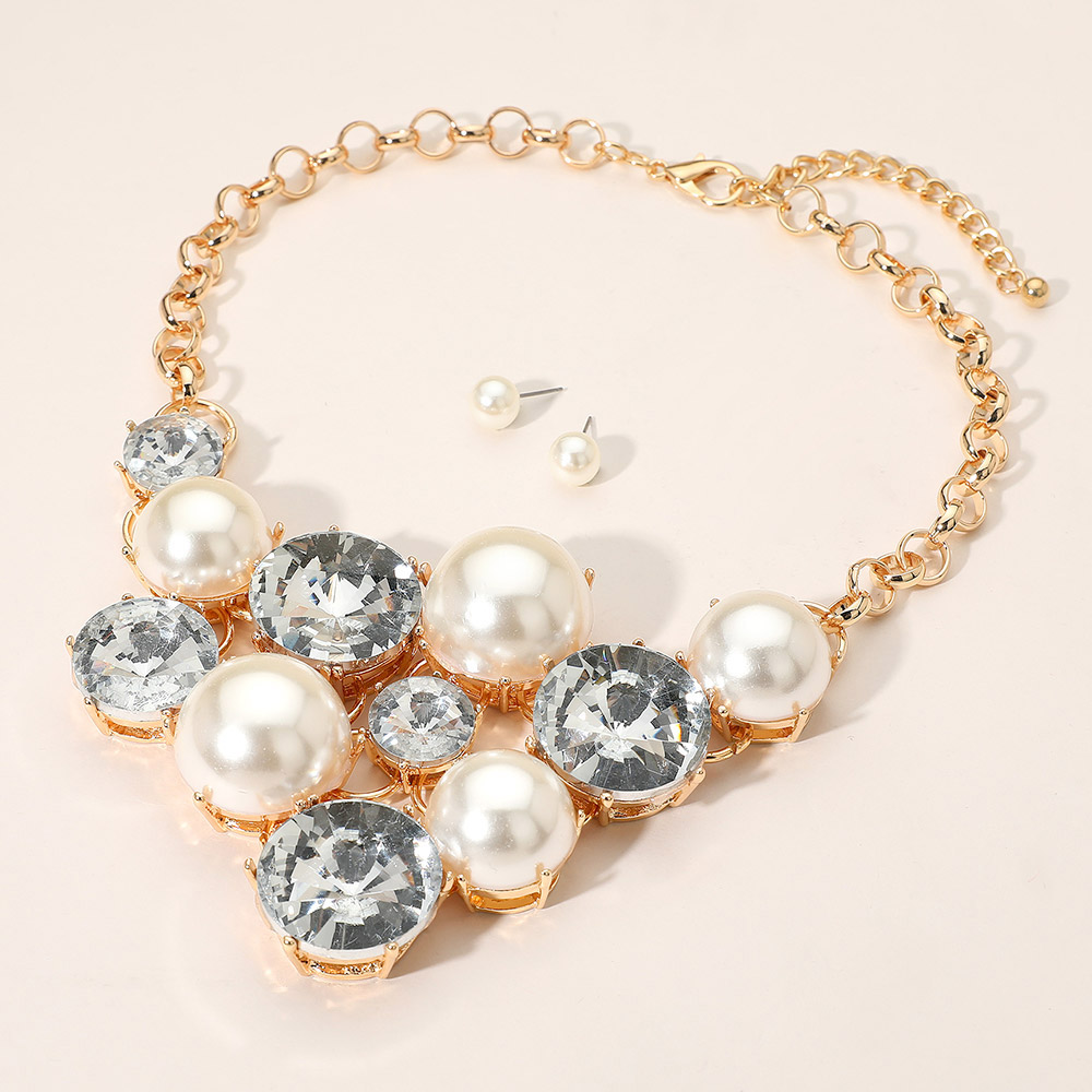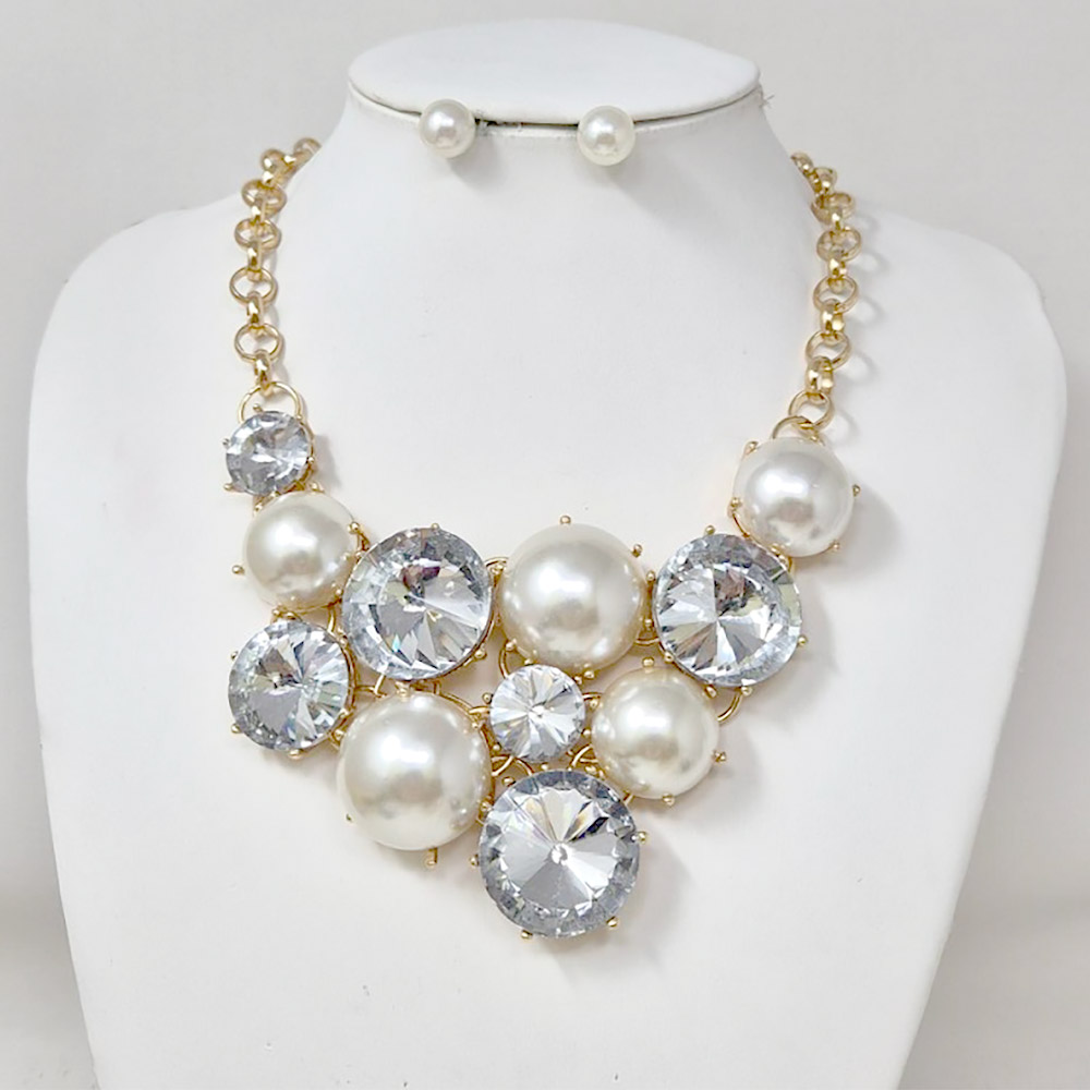 Details • Necklace Size : 19" + 3" L • Decor Size : 3.5" L • Earrings Size : 0.4" L • This elegant statement necklace features lustrous pearl-like accents paired with shimmering gemstones for a radiant finish. Complete with matching stud earrings, it offers a perfect blend of sophistication and glamour, ideal for weddings, galas, or upscale evening looks. • Lead and Nickel Compliant