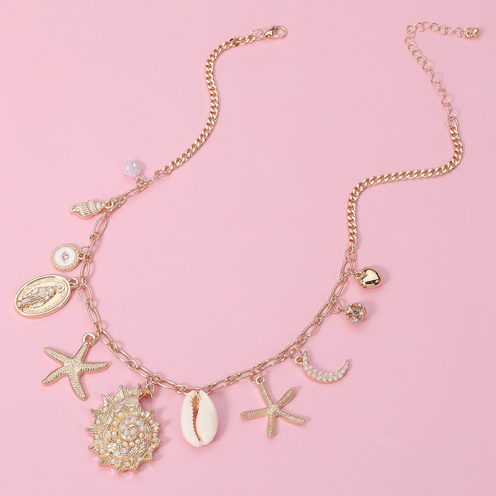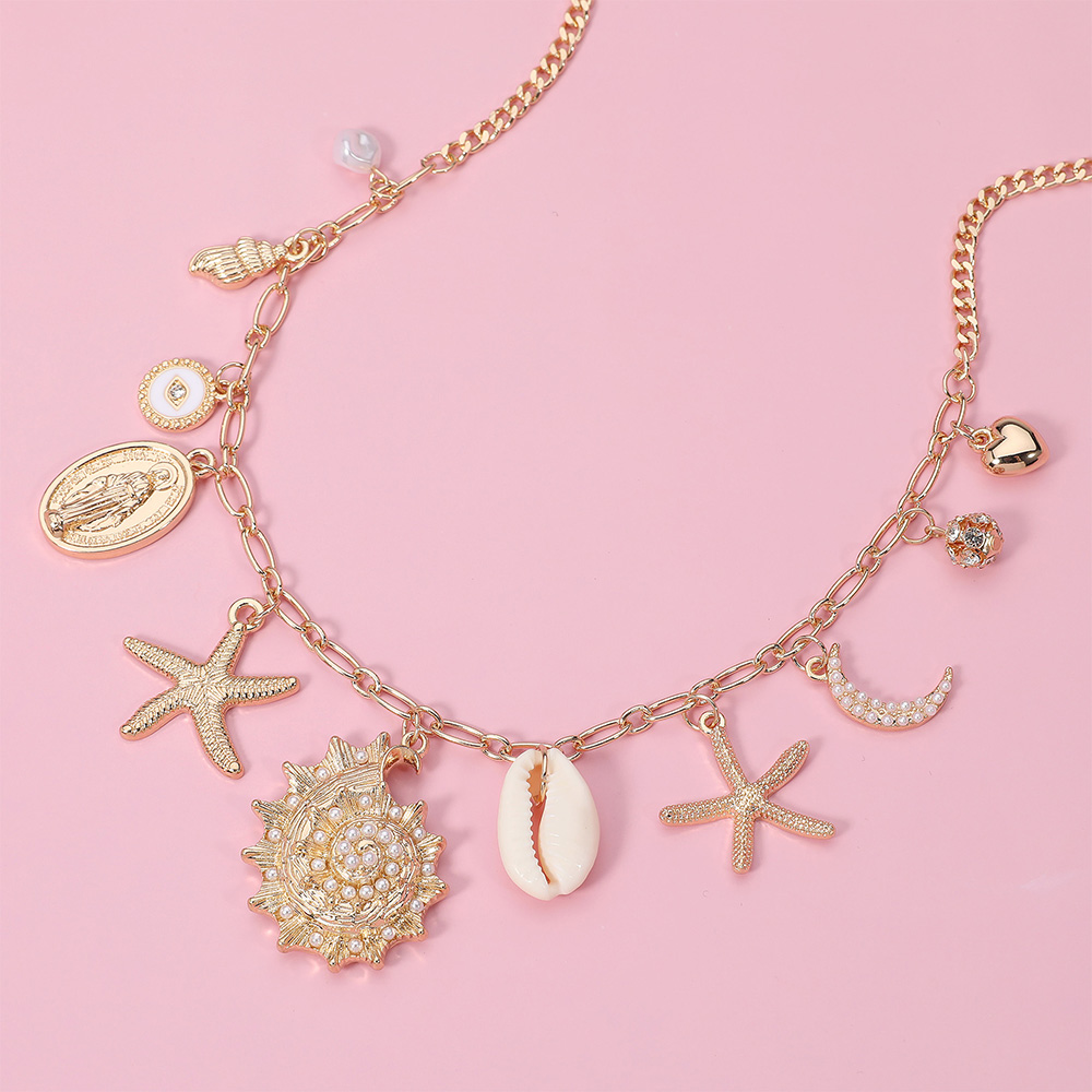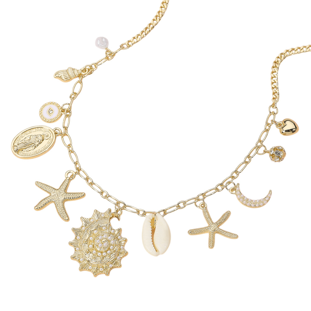Pearl Paved Shell Crescent Metal Starfish Heart Evil Eye Virgin Mary Charm Station Necklace