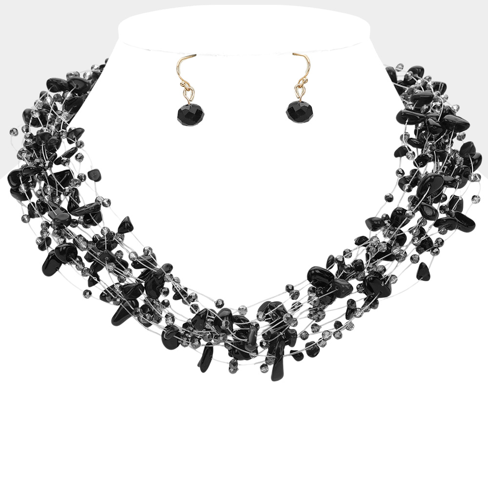 Pebble Faceted Beads Transparent Thread Multi Layered Strand Necklace