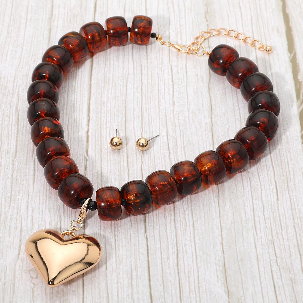 • Make a bold statement with this chunky beaded necklace featuring large round beads and a shiny heart pendant, perfectly paired with simple stud earrings. This eye-catching jewelry set brings playful charm and modern flair, making it a standout addition to both casual and dressy outfits.