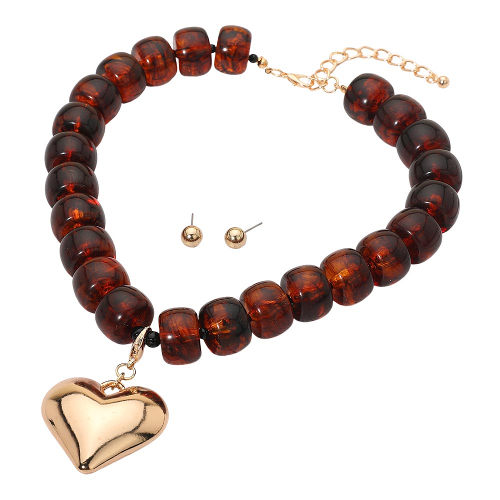 Puffy Metal Heart Pendant Chunky Beaded Statement Necklace
