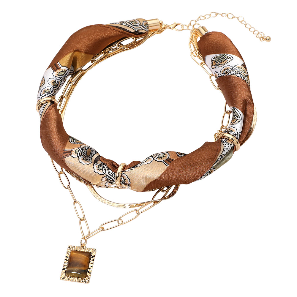 Rectangular Stone Pendant Accent Layered Fabric Scarf Necklace