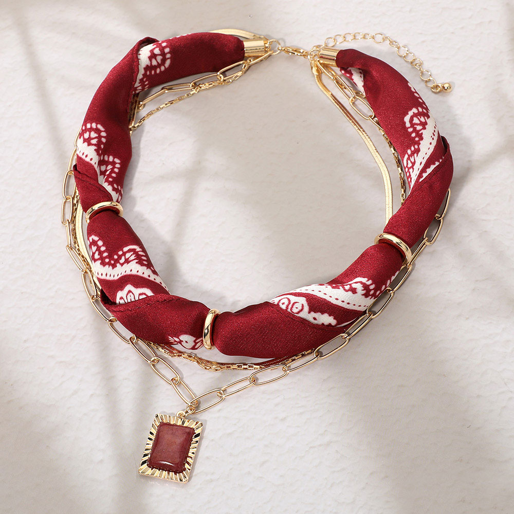 Rectangular Stone Pendant Accent Layered Fabric Scarf Necklace