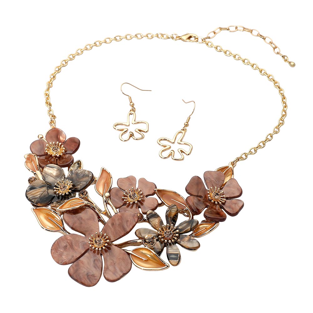 • This floral statement necklace and earring set showcases beautifully layered petals and delicate leaf accents, creating a bold yet elegant look. Perfect for special occasions or evening events, this coordinated set adds a sophisticated, feminine charm that enhances any ensemble.