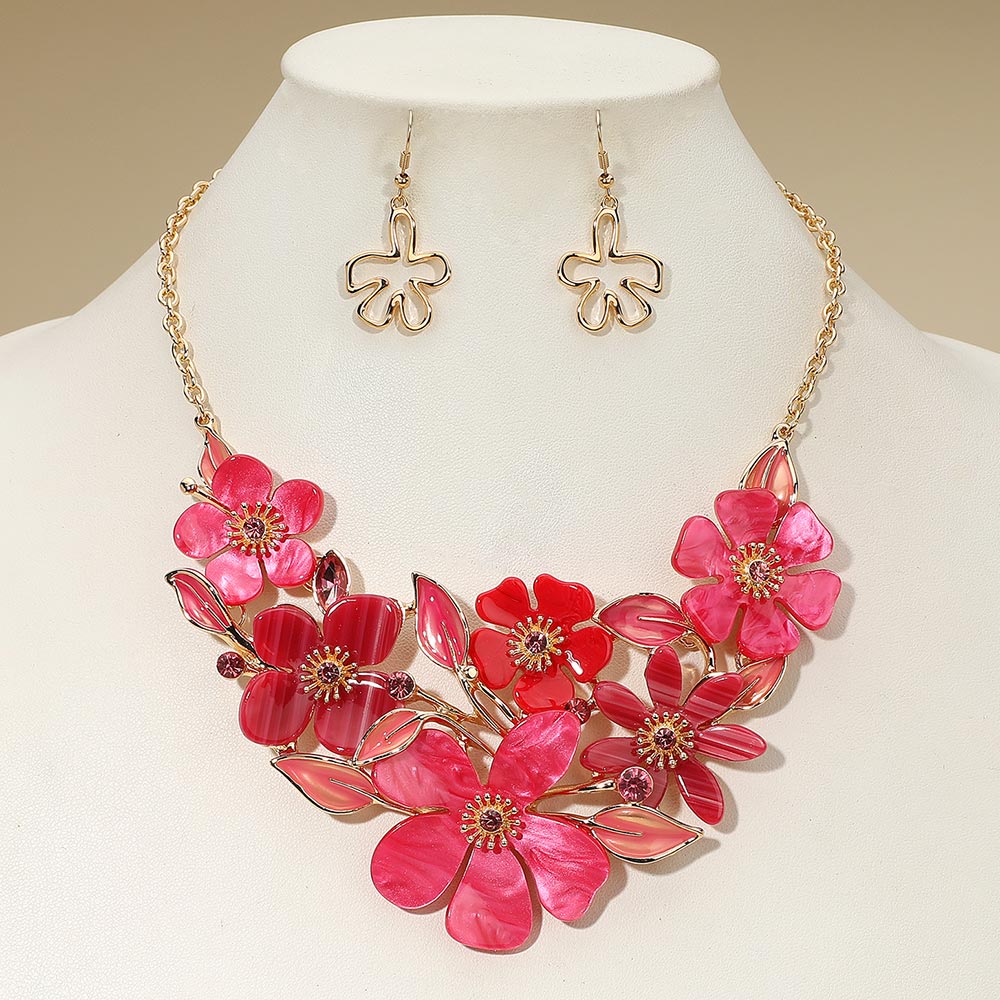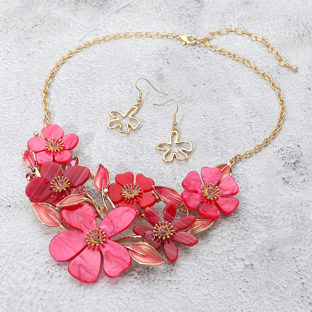Details • Necklace Size : 18" + 3" L • Decor Size : 2.9" L • Earrings Size : 1.75" L • This floral statement necklace and earring set showcases beautifully layered petals and delicate leaf accents, creating a bold yet elegant look. Perfect for special occasions or evening events, this coordinated set adds a sophisticated, feminine charm that enhances any ensemble. • Lead and Nickel Compliant