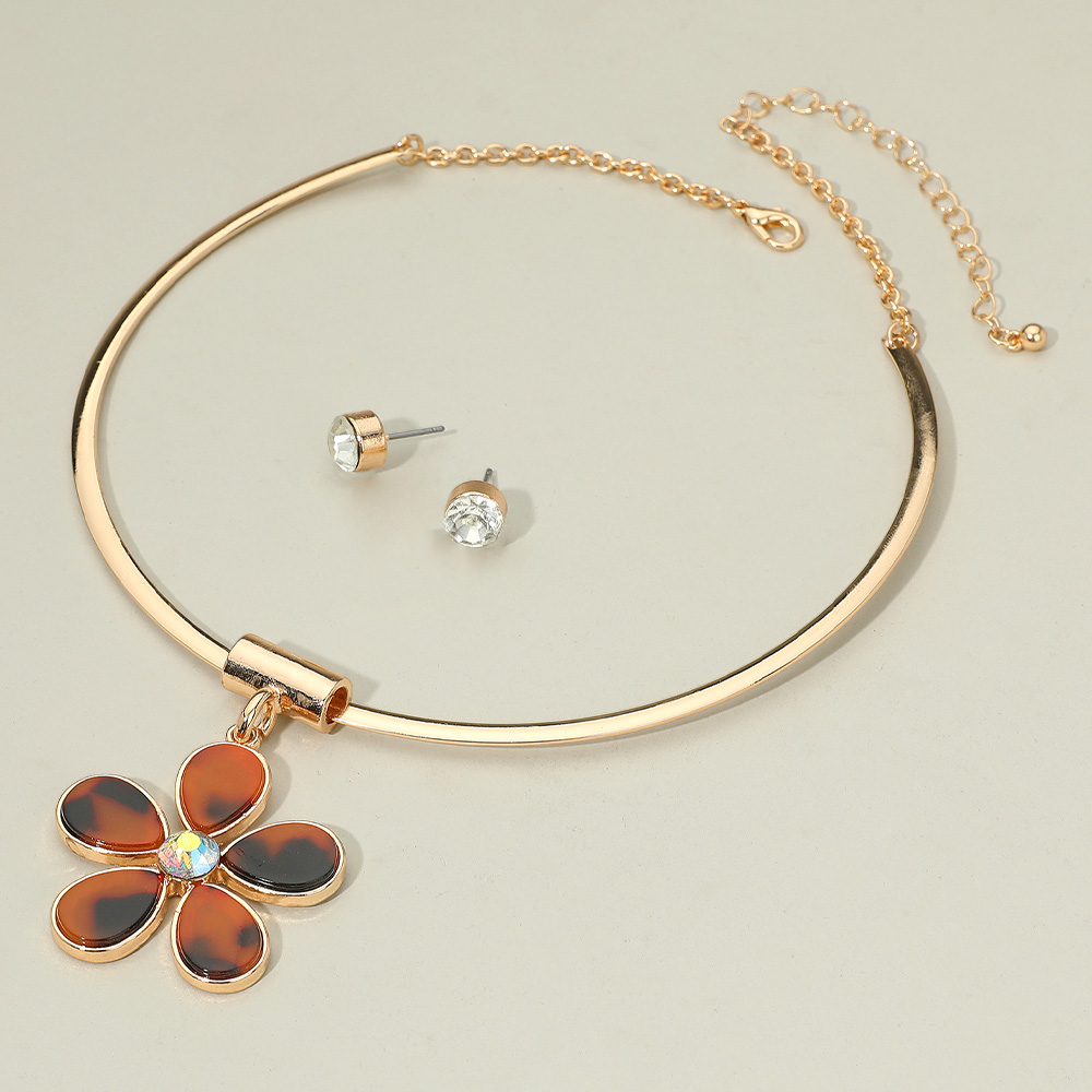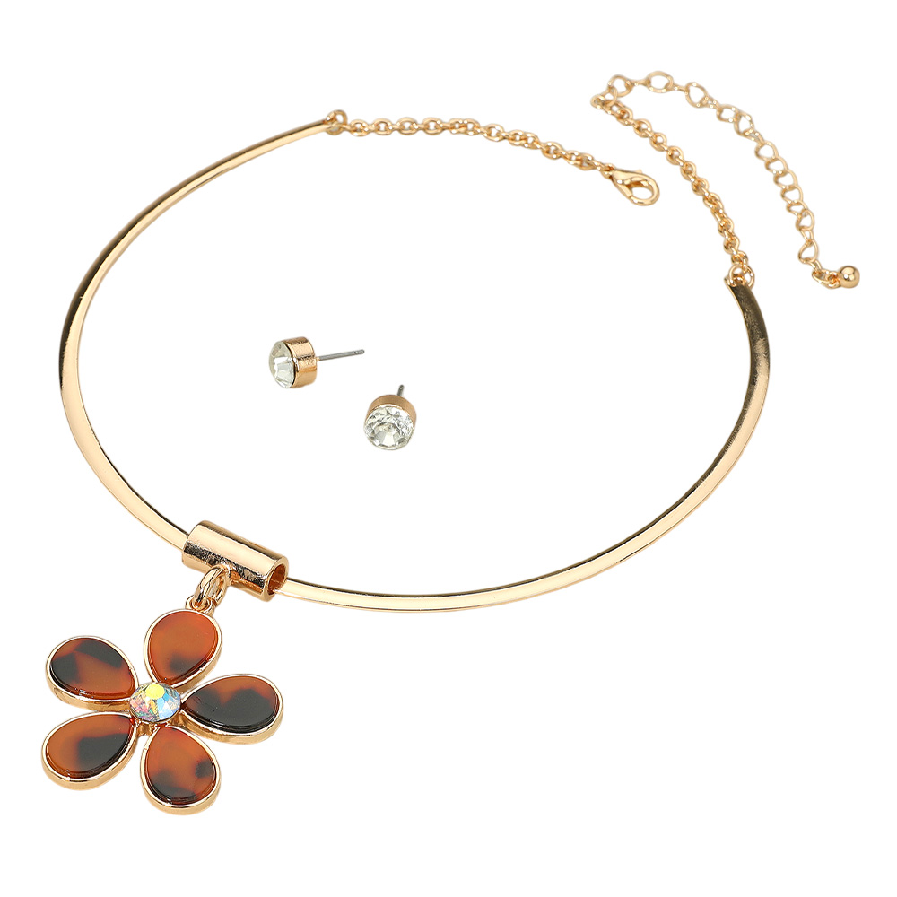 Details • Necklace Size : 16" + 5.5" L • Pendant Size : 1.5" X 2.1" • Earrings Size : 0.3" L • Elevate your look with this chic necklace set featuring a bold floral pendant and matching stud earrings. The sleek choker-style chain and petal design add a modern yet playful touch, perfect for casual outings or dressing up any outfit effortlessly. • Lead and Nickel Compliant