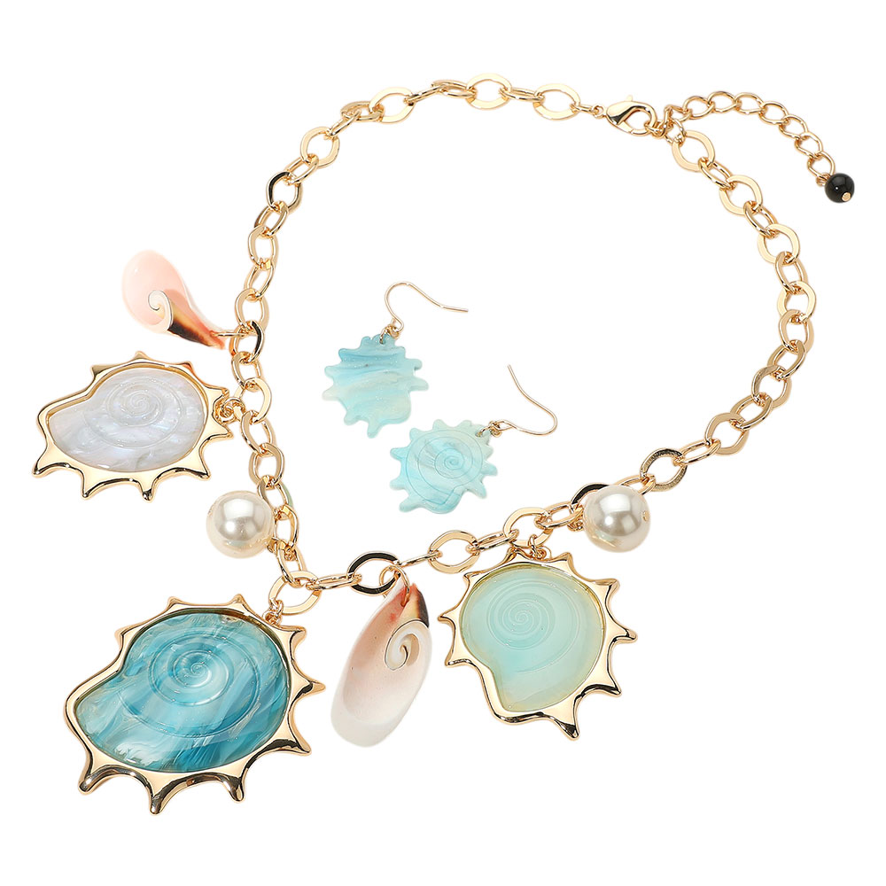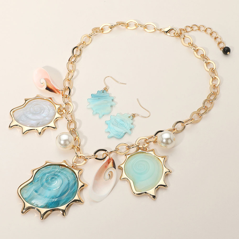 • Elegant necklace and earring set featuring spiral shell pendants, faux pearls, and shiny charm accents. A coastal-inspired design perfect for beach outings, summer events, or casual elegance.