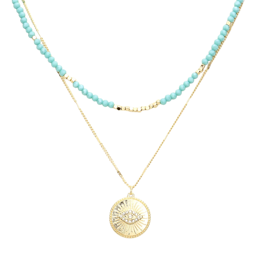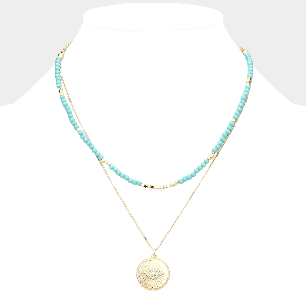 Rhinestone Embellished Evil Eye Metal Round Pendant Double Layered Necklace