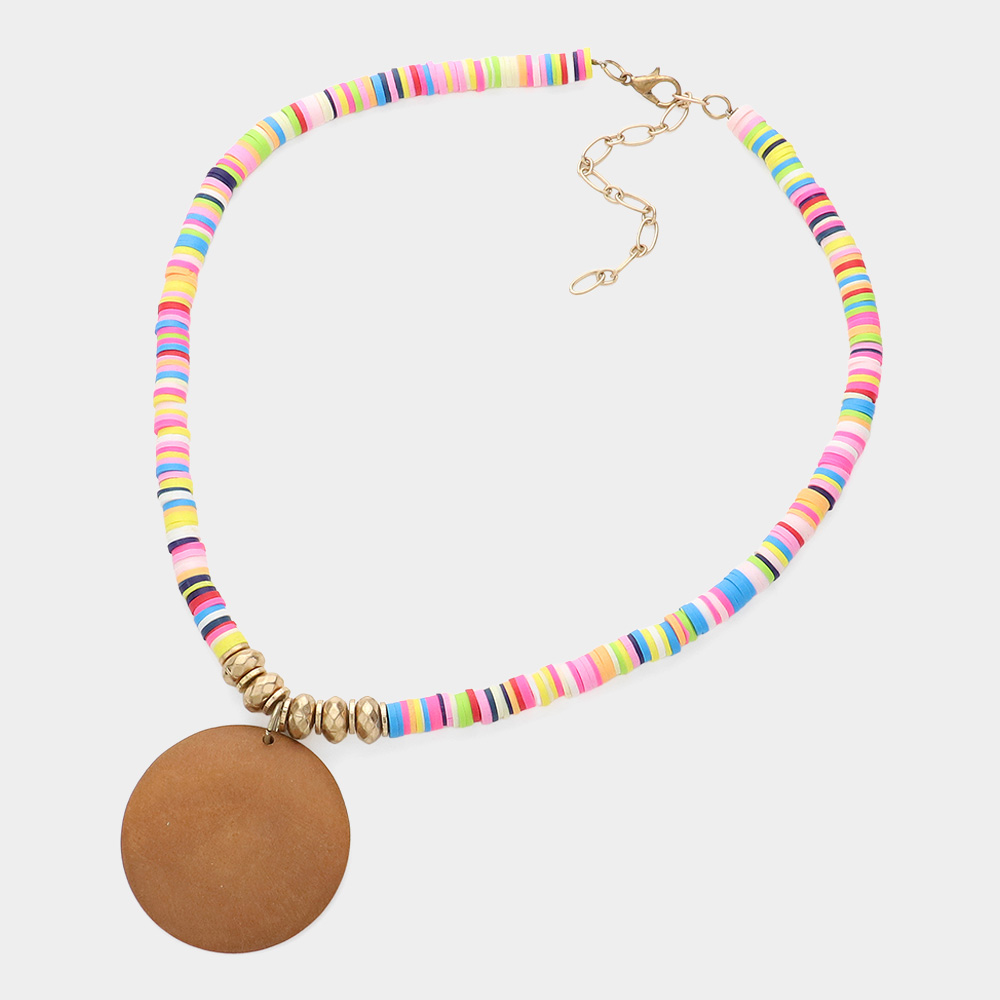 Wood Heishi Beaded Abalone Crescent Pendant Triple Layered Pendant Necklace