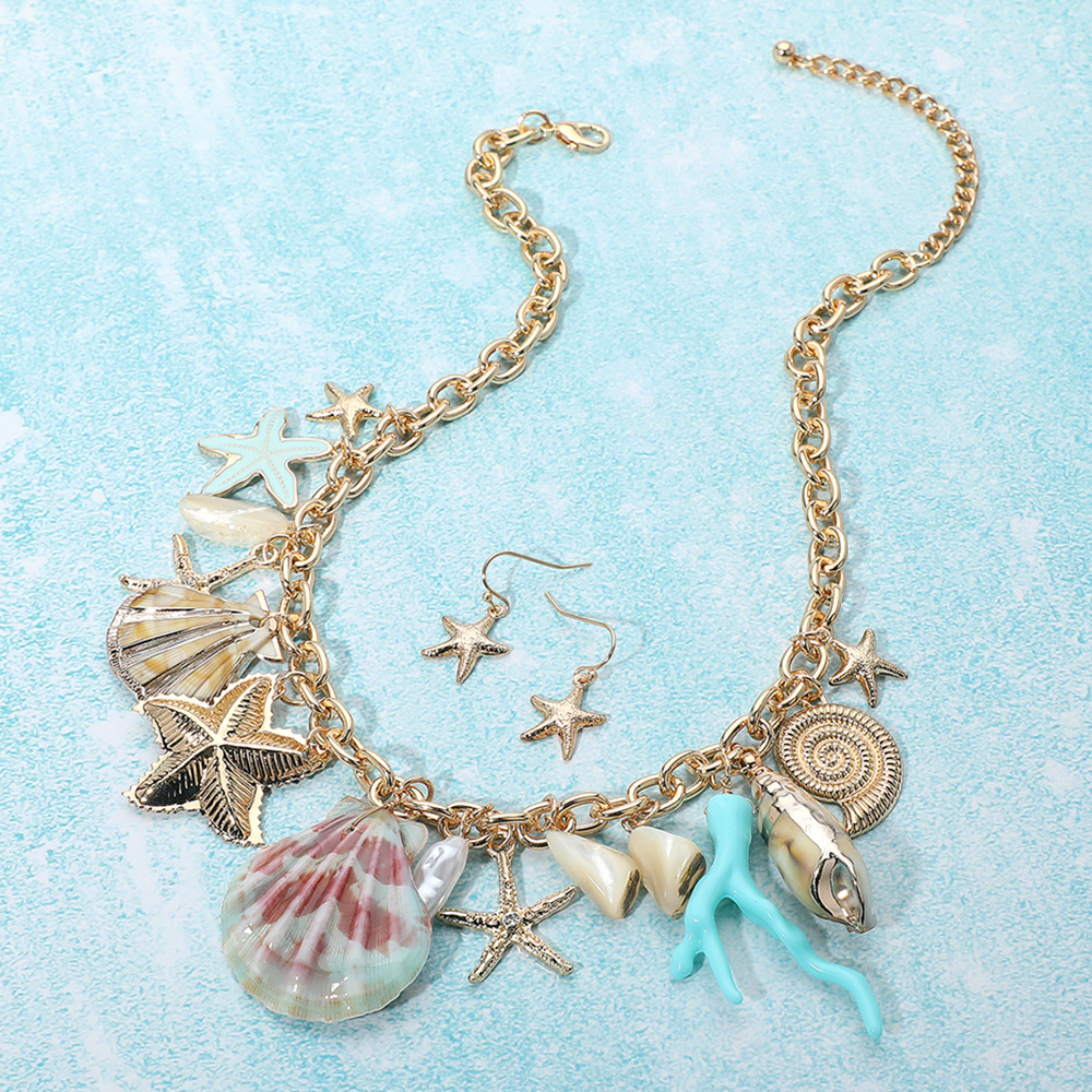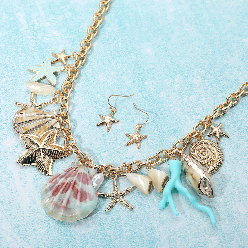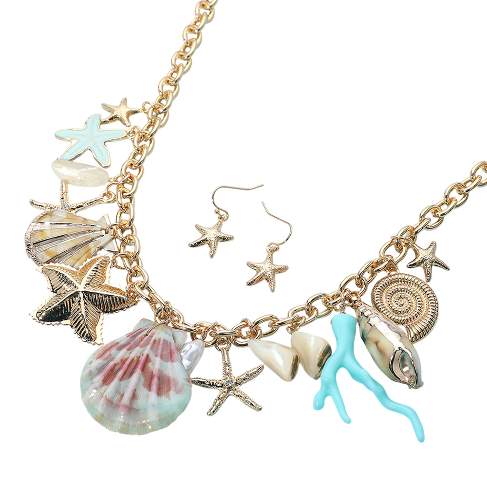 Seashell Starfish Puka Shell Coral Charm Embellished Statement Necklace