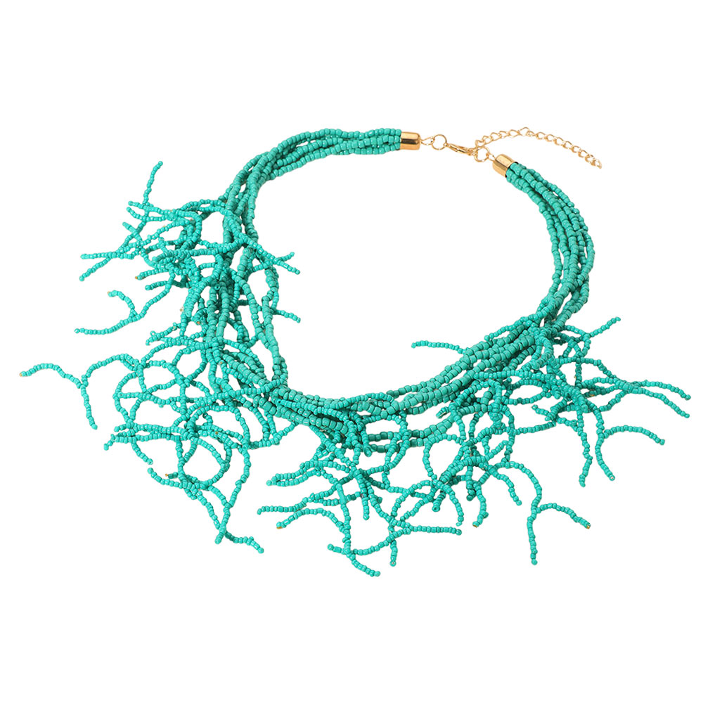 • Elevate any look with this statement beaded coral necklace featuring layered clustered strands and branch-inspired shapes. Includes an adjustable extension chain for a comfortable fit. A bold, artistic accessory perfect for standout styling.