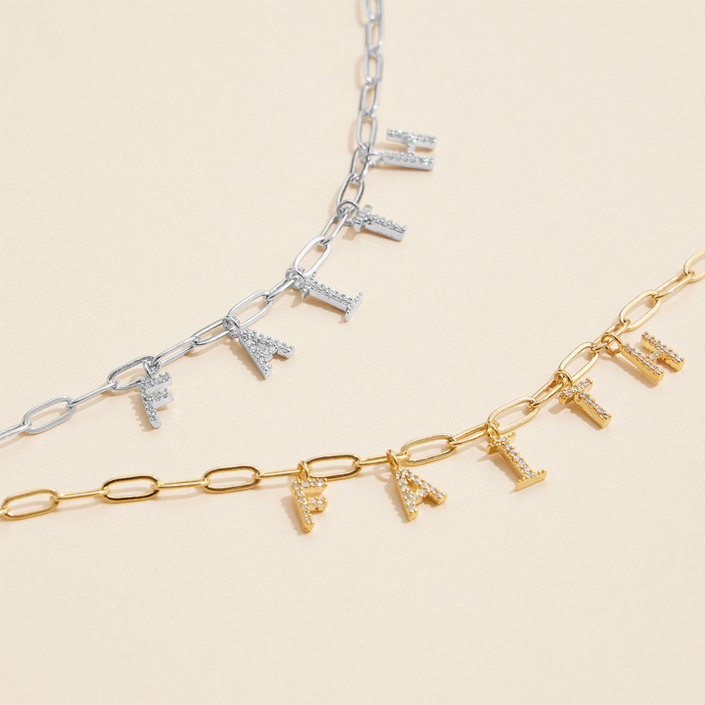 Semi Fine Collection - 18K Gold Dipped Brass Metal Stone Paved FAITH Monogram Charm Paperclip Chain Necklace