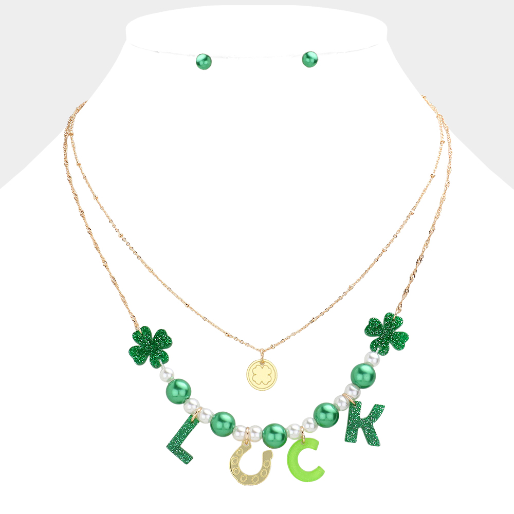 St. Patrick's Day LUCK Message Glittered Resin Clover Horseshoe Pearl Double Layered Necklace