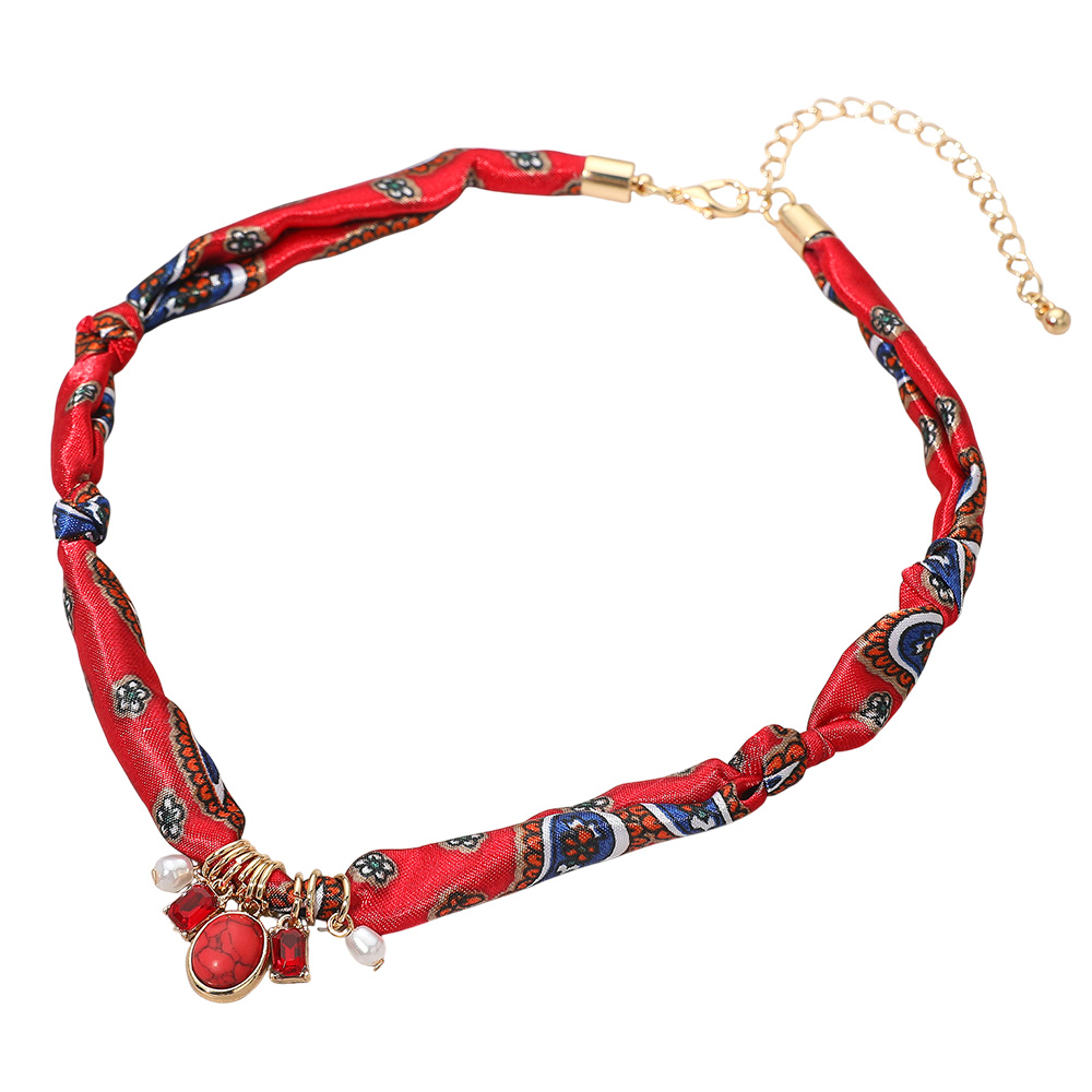 Details • Necklace Size : 15.5" + 3.5" L • Decor Size : 0.8" L • Pattern May Vary • Make a bold fashion statement with this bohemian scarf necklace, accented with decorative charms and pearls. Featuring a unique patterned fabric design, this versatile piece adds a playful yet elegant touch to casual outfits or evening looks. • Lead and Nickel Compliant