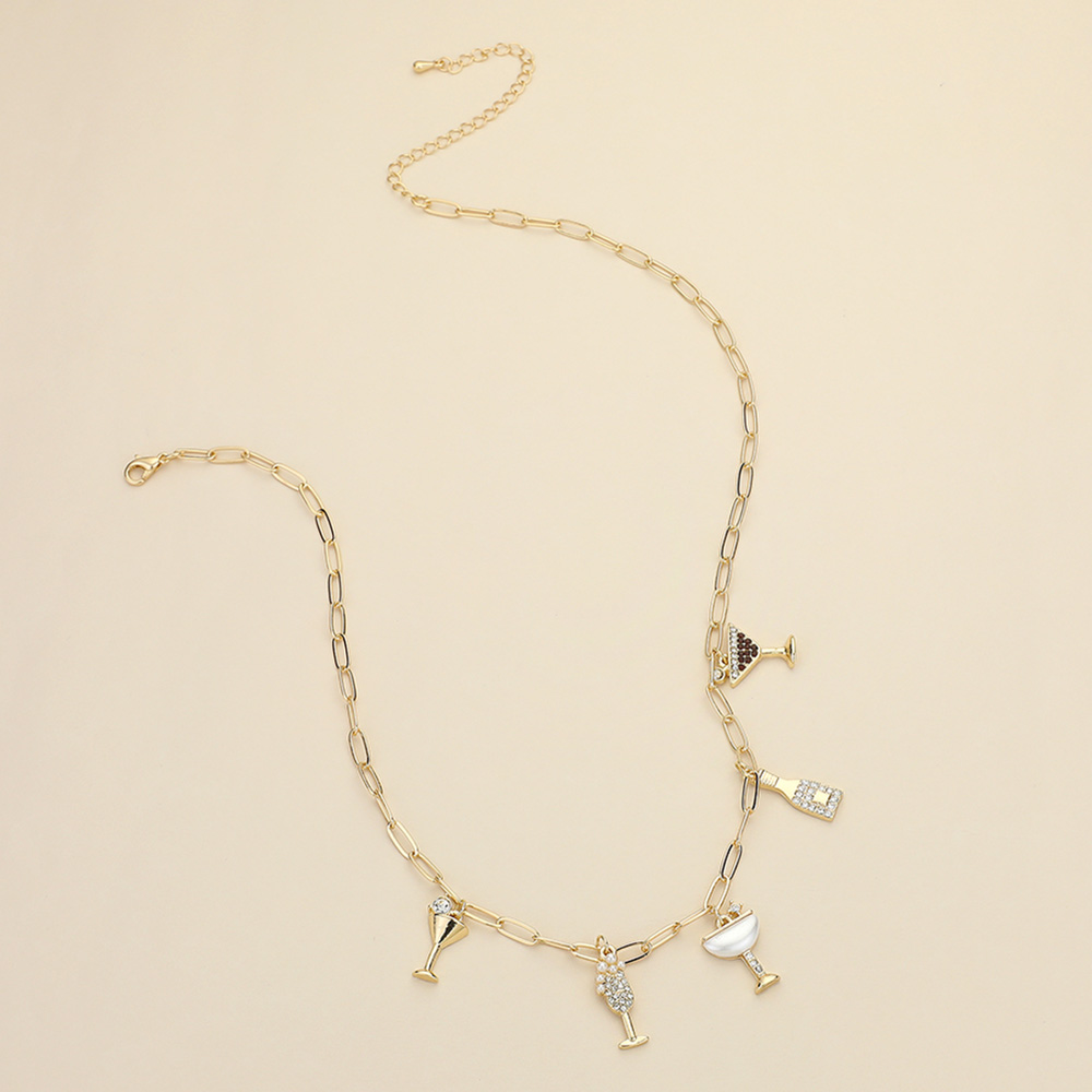 Stone Paved Cocktail Glass Bottle Charm Station Paperclip Chain Necklace
