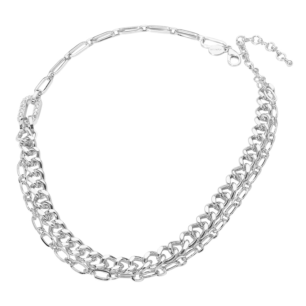 Details • Necklace Size : 19" + 3" L • Decor Size : 0.7" L • Stylish statement necklace combining bold curb and elongated link chains for a modern layered effect. Features an asymmetrical design with a touch of sparkle, perfect for elevating any outfit with contemporary sophistication and versatile everyday appeal. • Lead and Nickel Compliant