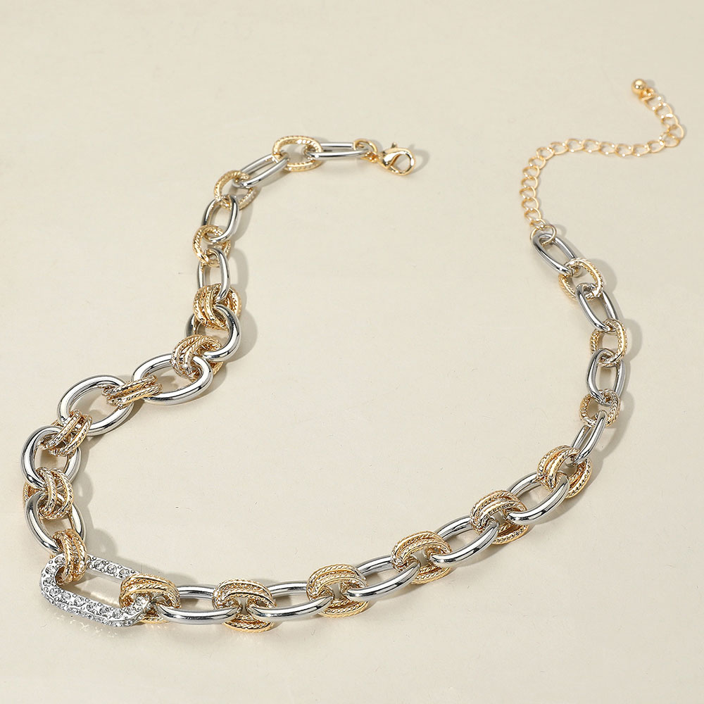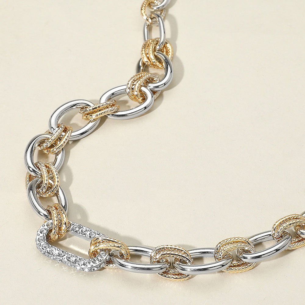 Stone Paved Oval Ring Accented Two Tone Chunky Chain Necklace