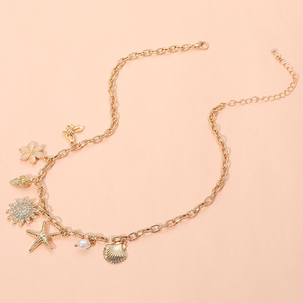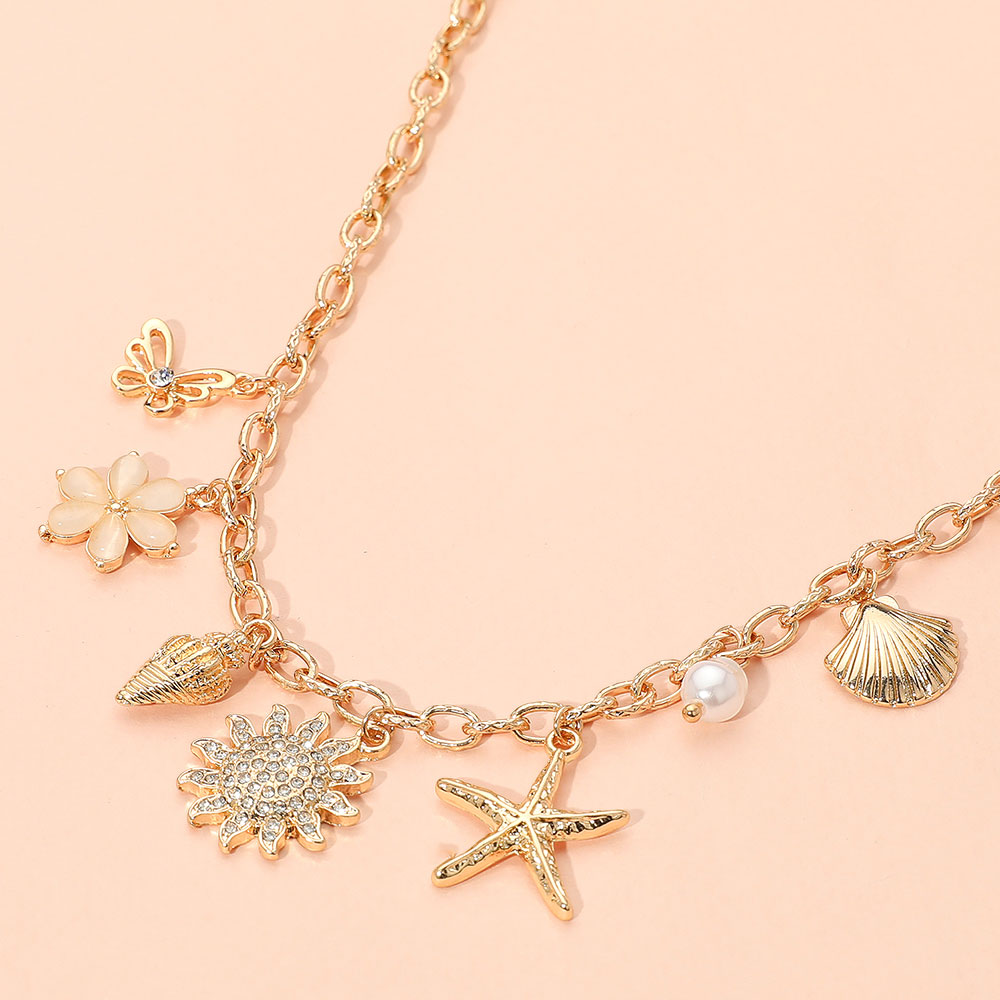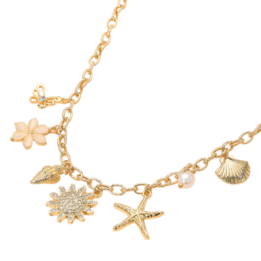 Sun Starfish Sea Shell Flower Butterfly Pearl Charm Station Necklace